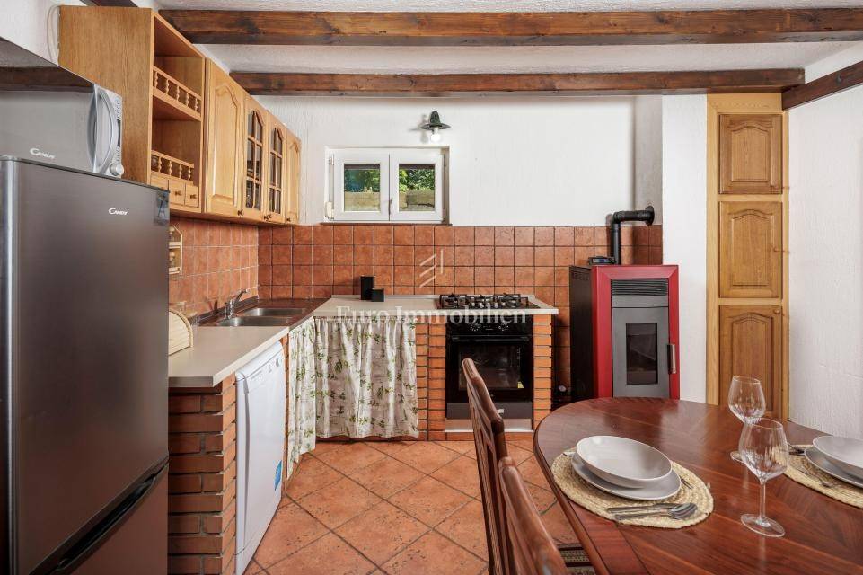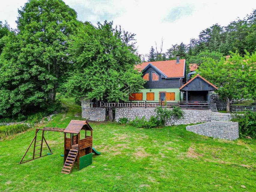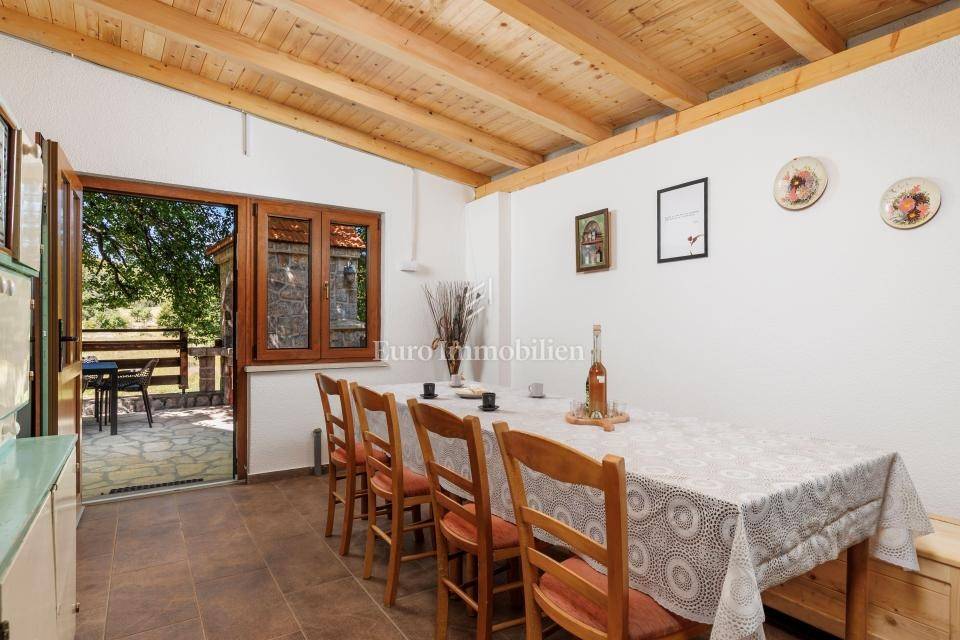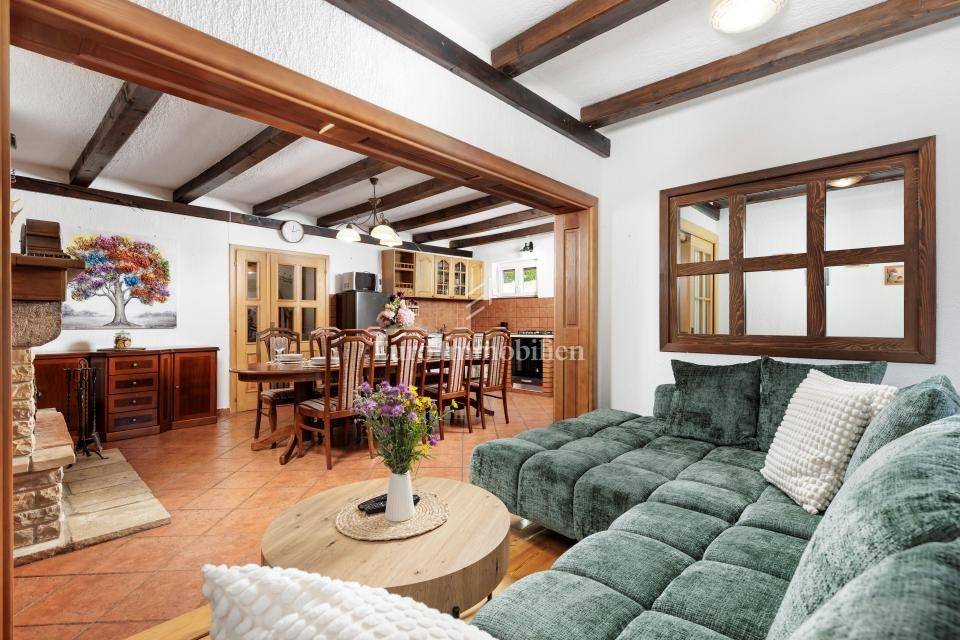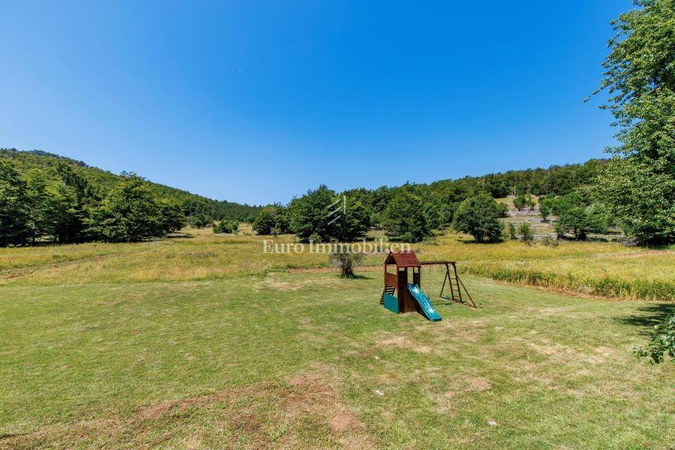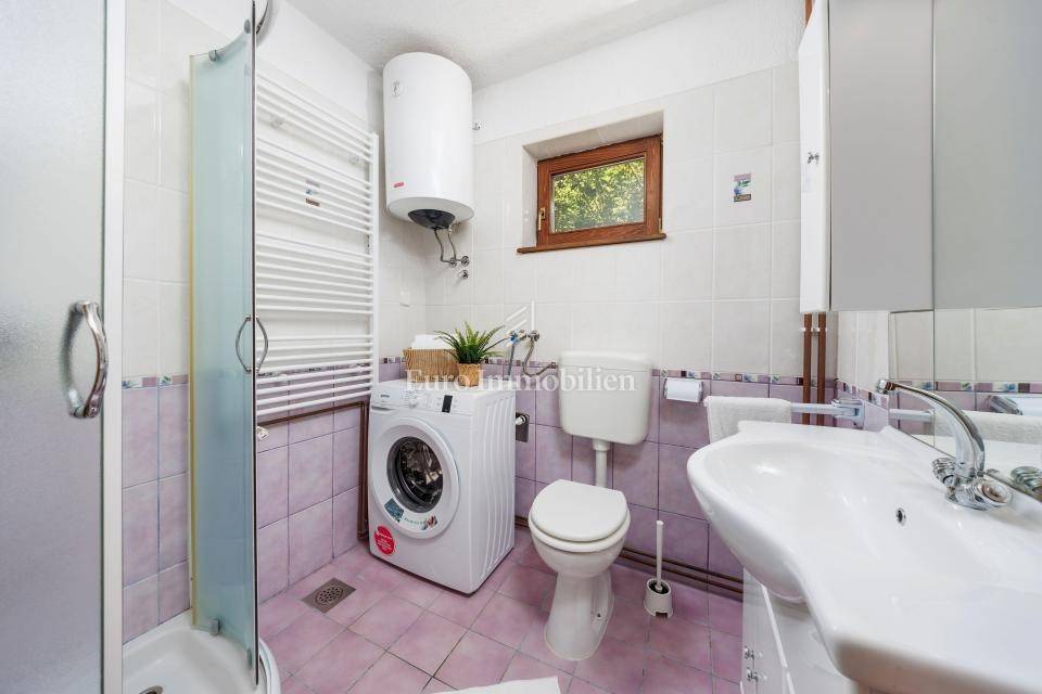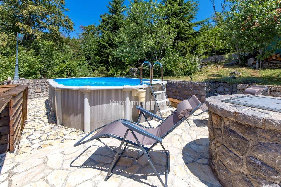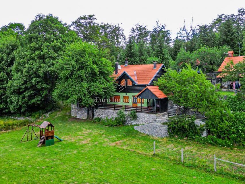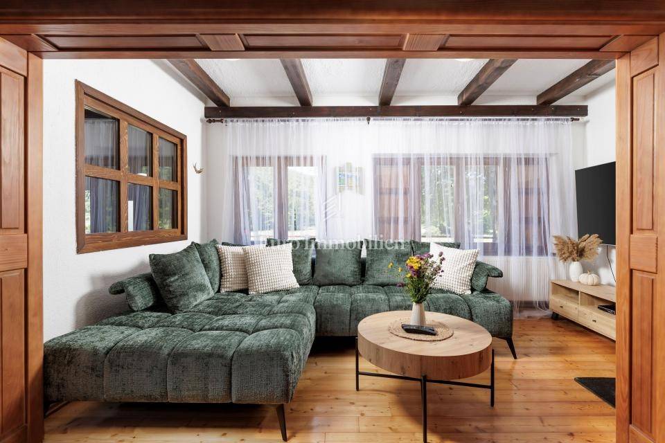 Ein kleines Nebengebäude dient als zusätzliche Unterkunft oder für weitere Zwecke. Der terrassenförmig angelegte Garten verfügt über Pool, Sonnendeck, Grillplatz, Leseecke im Freien und Kinderspielplatz. Großzügiger Parkplatz und Wiese im Wald bieten Ruhe und Privatsphäre.