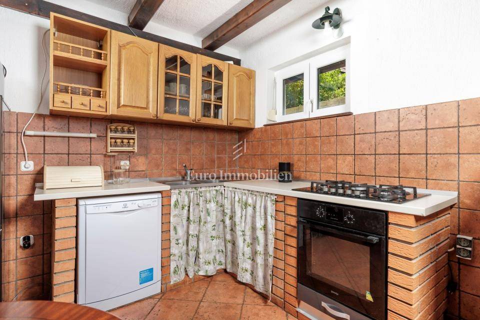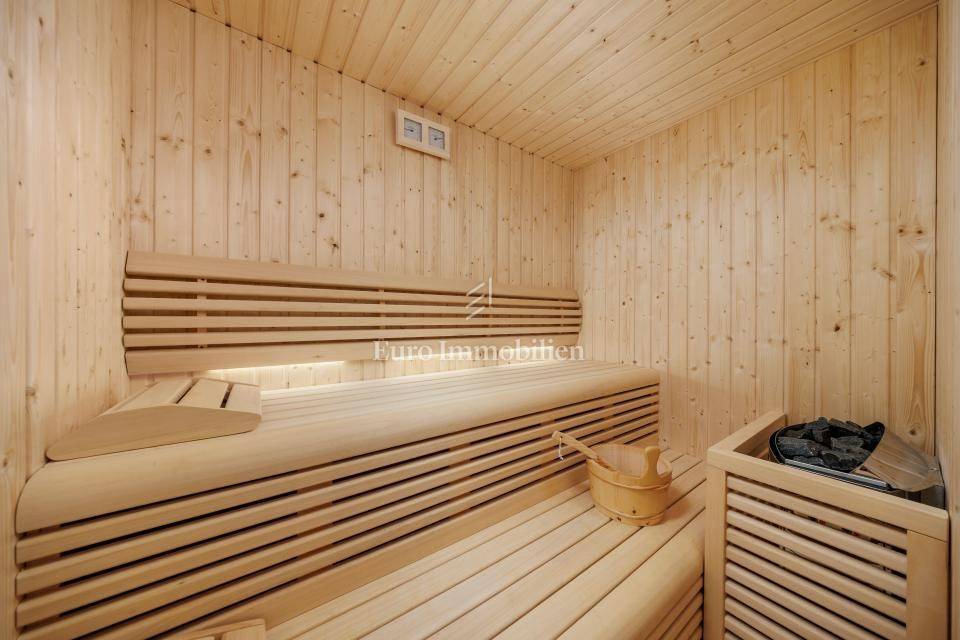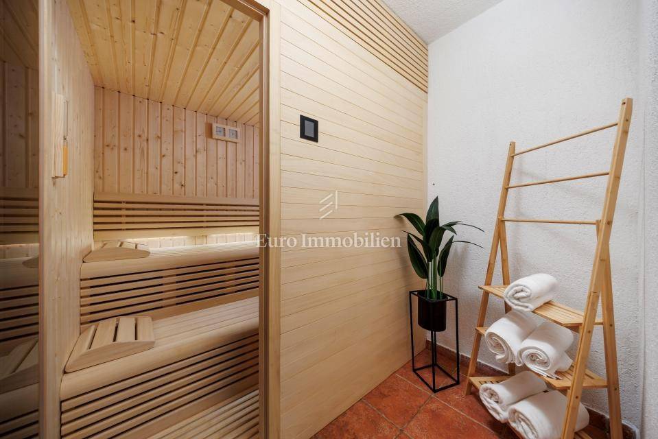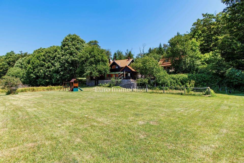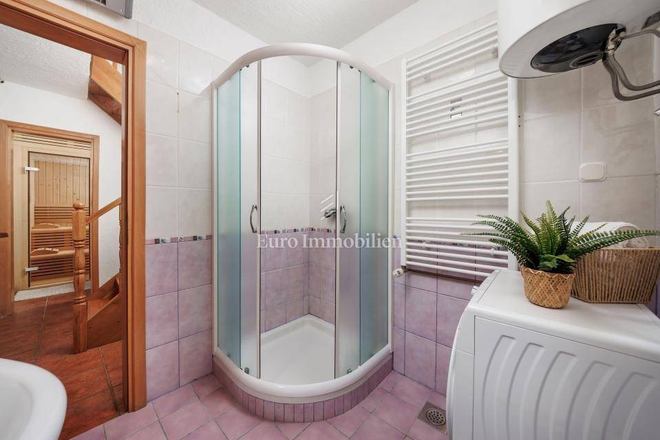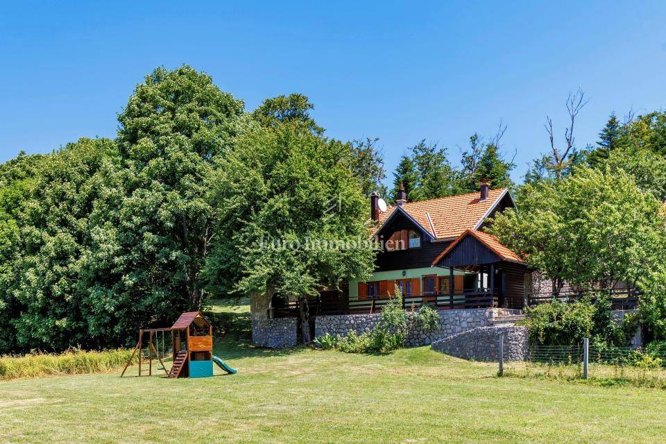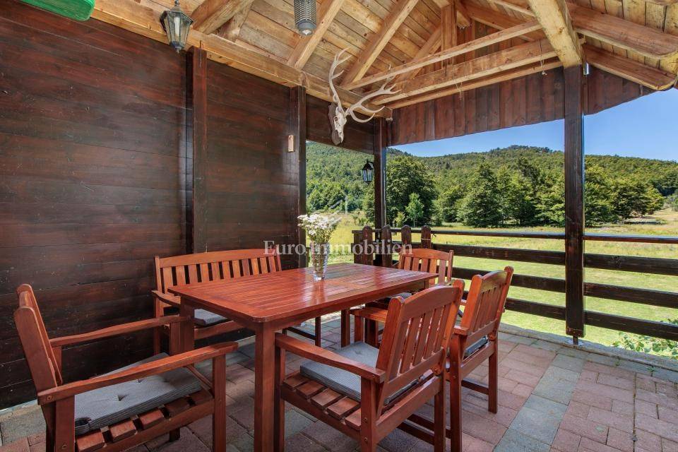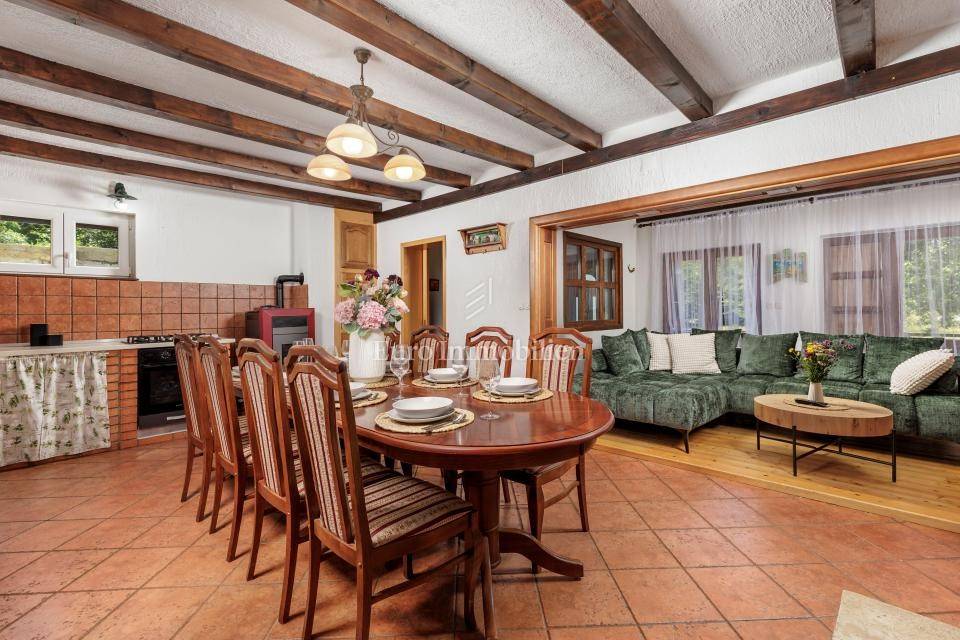 Ein kleines Nebengebäude dient als zusätzliche Unterkunft oder für weitere Zwecke. Der terrassenförmig angelegte Garten verfügt über Pool, Sonnendeck, Grillplatz, Leseecke im Freien und Kinderspielplatz. Großzügiger Parkplatz und Wiese im Wald bieten Ruhe und Privatsphäre.