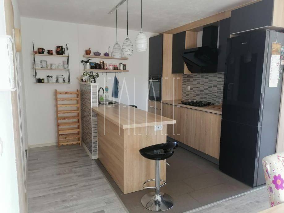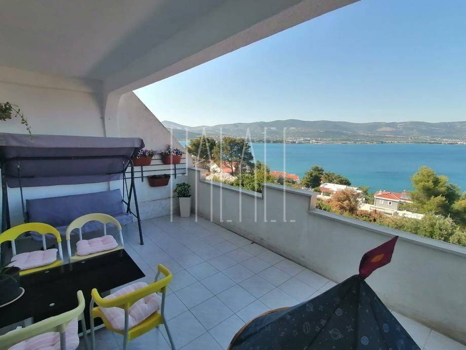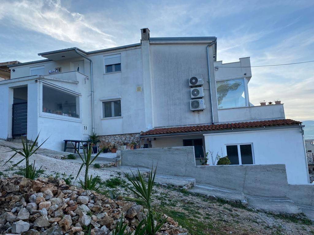 Die Wohnung im ersten Stock des Hauses hat eine Gesamtfläche von 100m² und umfasst eine Küche mit Essbereich, Wohnzimmer, Badezimmer, WC, zwei Schlafzimmer und eine große Terrasse mit Blick auf die gesamte Bucht von Kaštela. Da das Haus auf terrassiertem Gelände gebaut ist, verfügt die Wohnung im ersten Stock über einen großen Innenhof mit Grill, der als Außensommerküche genutzt wird. Der Innenhof beinhaltet auch einen kleinen Abstellraum.