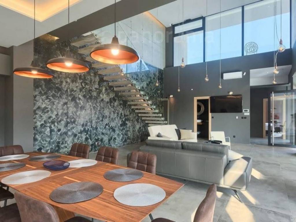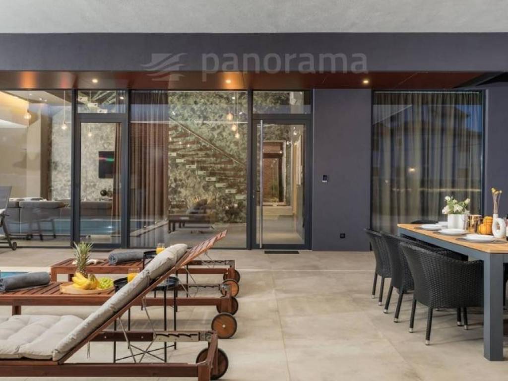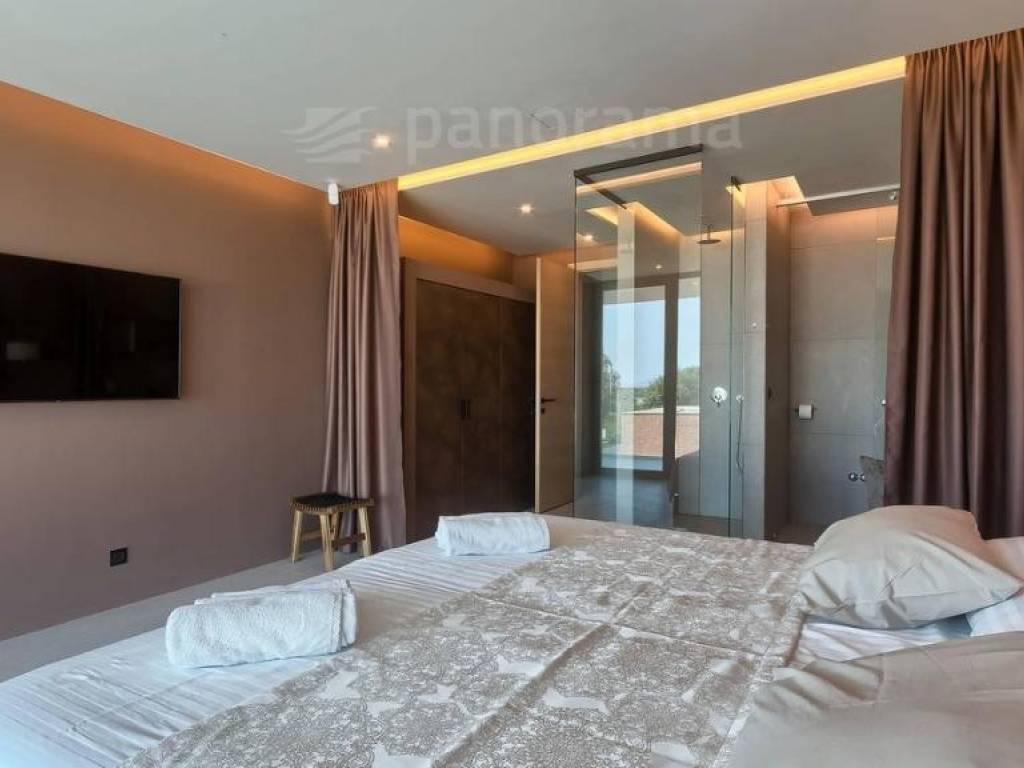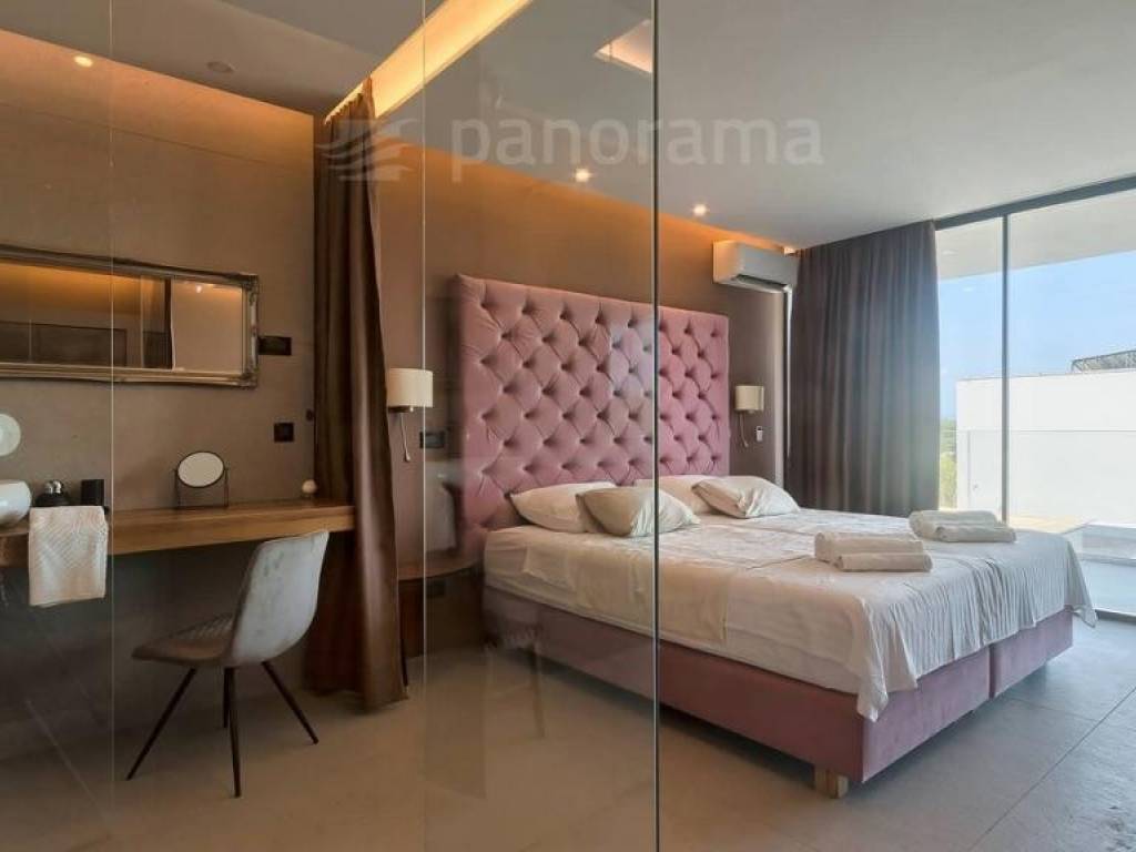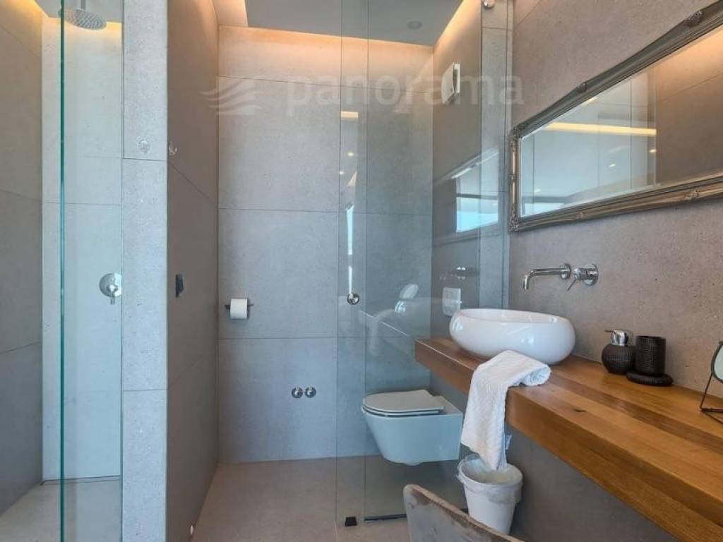 Im Erdgeschoss der Villa gibt es ein offenes Wohnzimmer mit Küche und Esszimmer und einen Freizeitbereich, alle mit Zugang zu einer beeindruckenden überdachten Terrasse, sowie 1 Schlafzimmer mit Bad und WC. Im Obergeschoss befinden sich 3 weitere Schlafzimmer mit eigenen Bädern und Zugang zur Terrasse mit wunderschönem Blick auf das Meer und die Bucht. Die Zimmer sind größer als der Durchschnitt, mit Glaswänden vom Boden bis zur Decke, gestaltet und eingerichtet. Im Inneren sticht die innenliegende Eingangshalle mit einer Höhe von 7,5 Metern hervor, die von einer luftigen Treppe umgeben ist, die in das erste Obergeschoss führt. Besonders attraktiv ist die Nähe des Pools selbst zum Innenraum - versteckt unter dem Obergeschoss, nur 5 Meter vom Wohn- und Esszimmer entfernt.