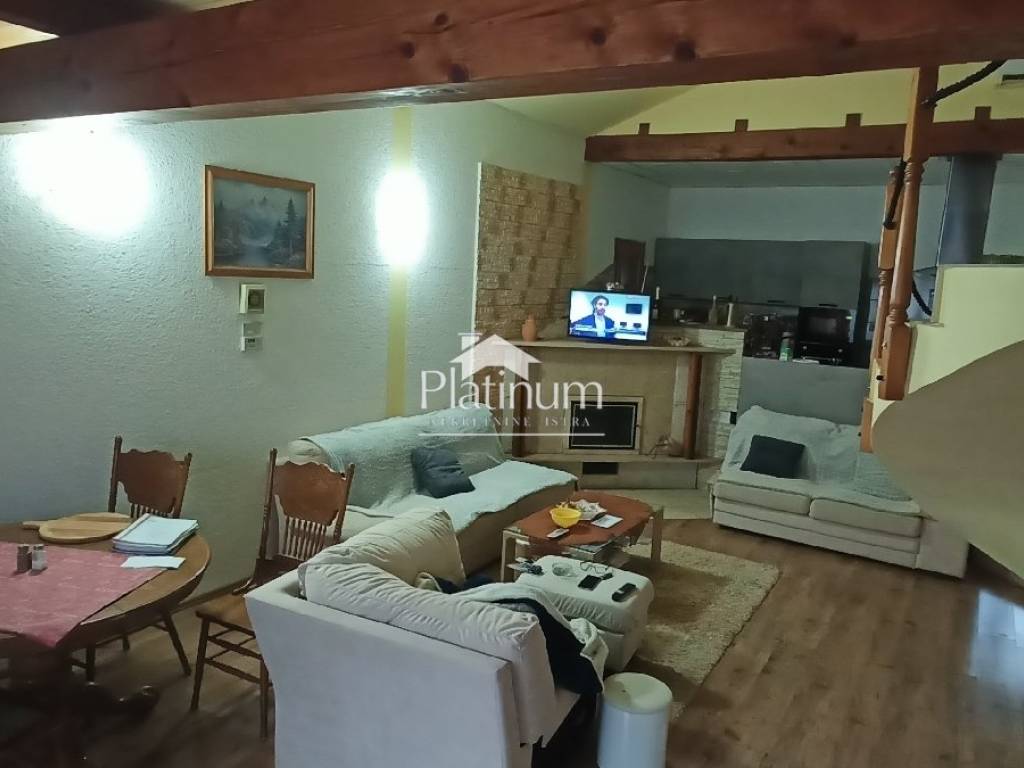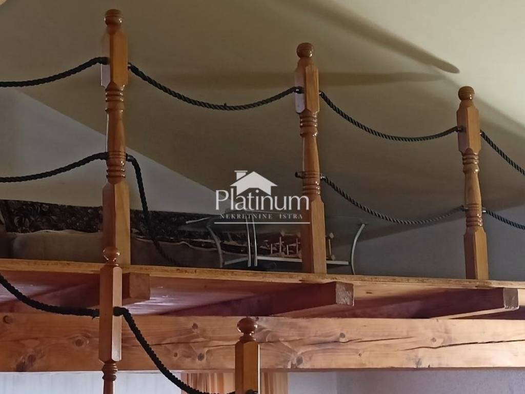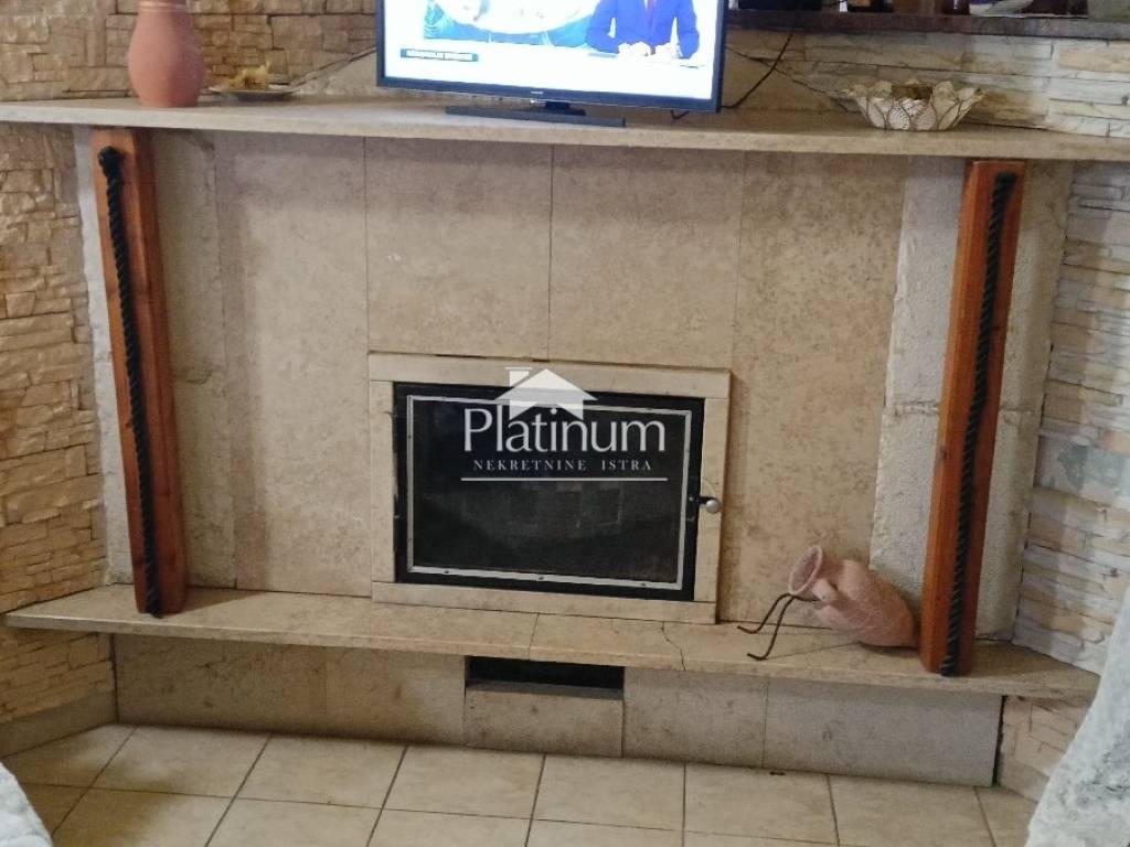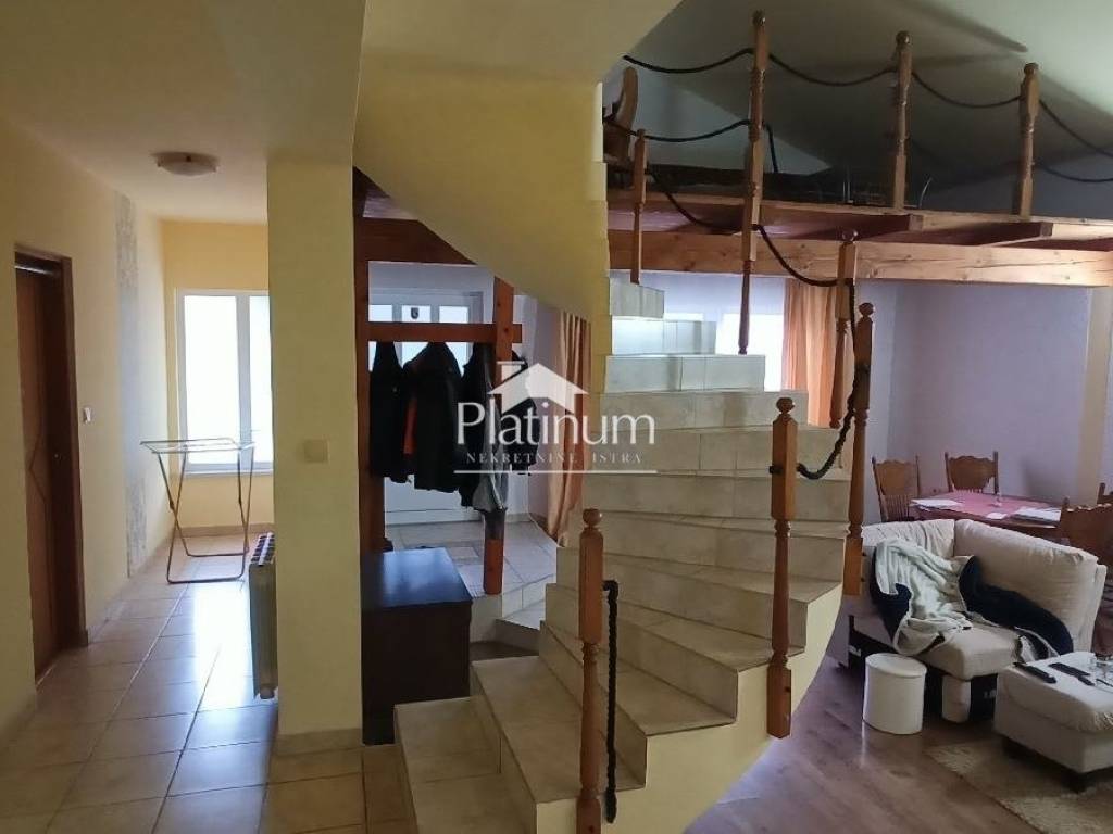 In Šikići, unweit von Pula, steht ein einstöckiges Haus mit einem Mansardengrundriss von 158 m2 zum Verkauf, das aus einer Eingangshalle und einem offenen Raum bestehend aus einem Wohnzimmer, einem Essbereich und einer Küche besteht Ein Teil und im anderen Teil drei Schlafzimmer und ein Badezimmer. Die Küche ist durch eine Tür mit der Taverne verbunden, wo sich ein Kamin, eine Speisekammer und eine Toilette befinden. In einem Teil des Raumes gibt es außerdem eine automatisierte Zentralheizung, die an den Kamin im Wohnzimmer angeschlossen ist (Kombinationsheizung mit Thermostat). Vom Wohnzimmer aus steigen wir die Wendeltreppe zur Galeri