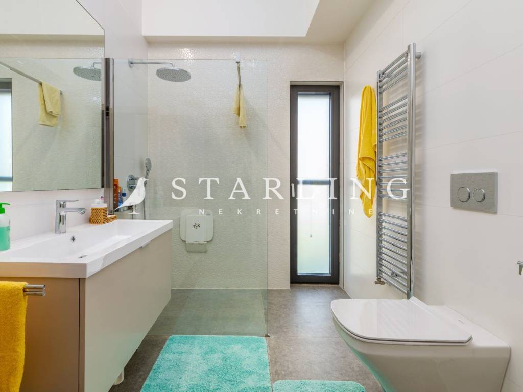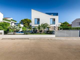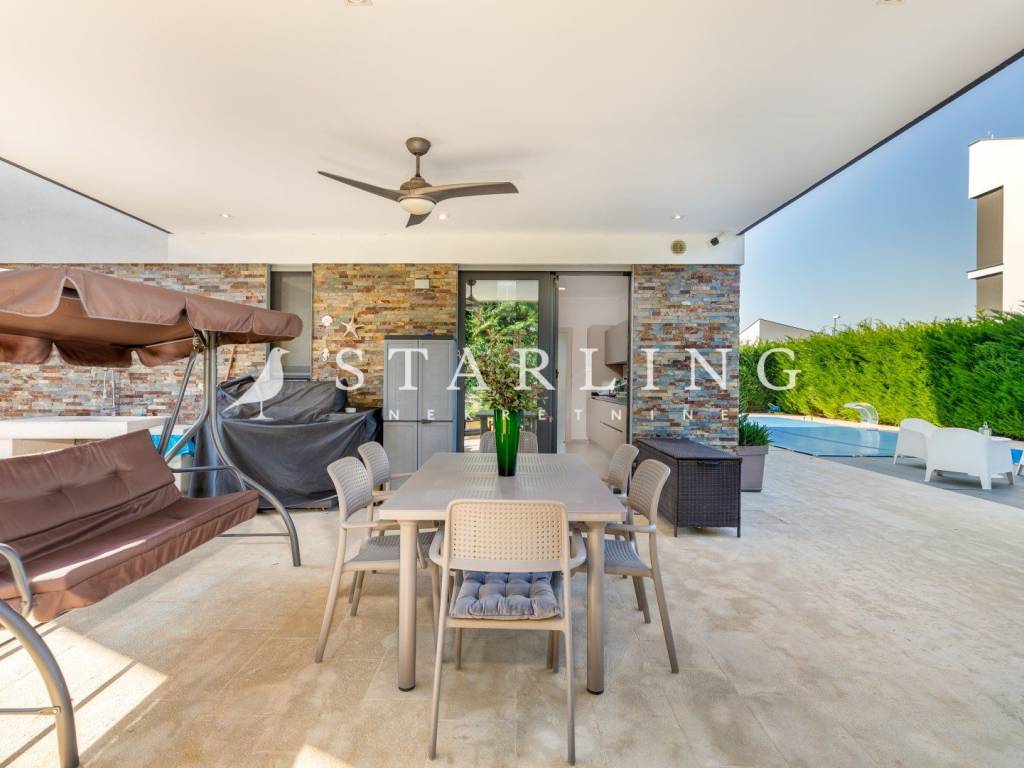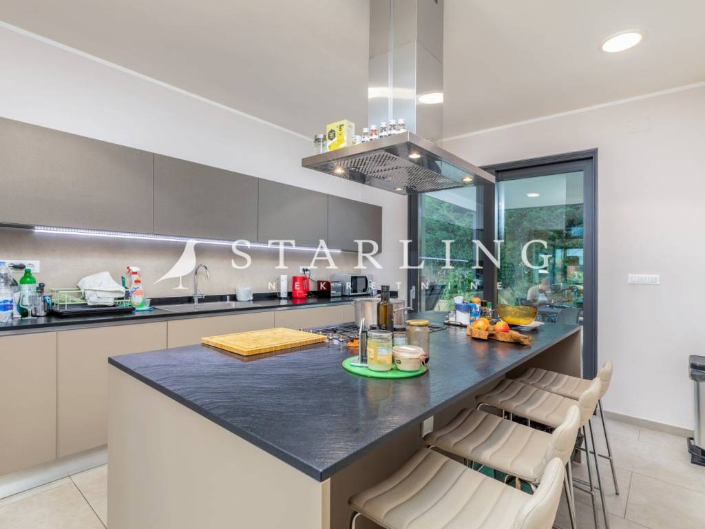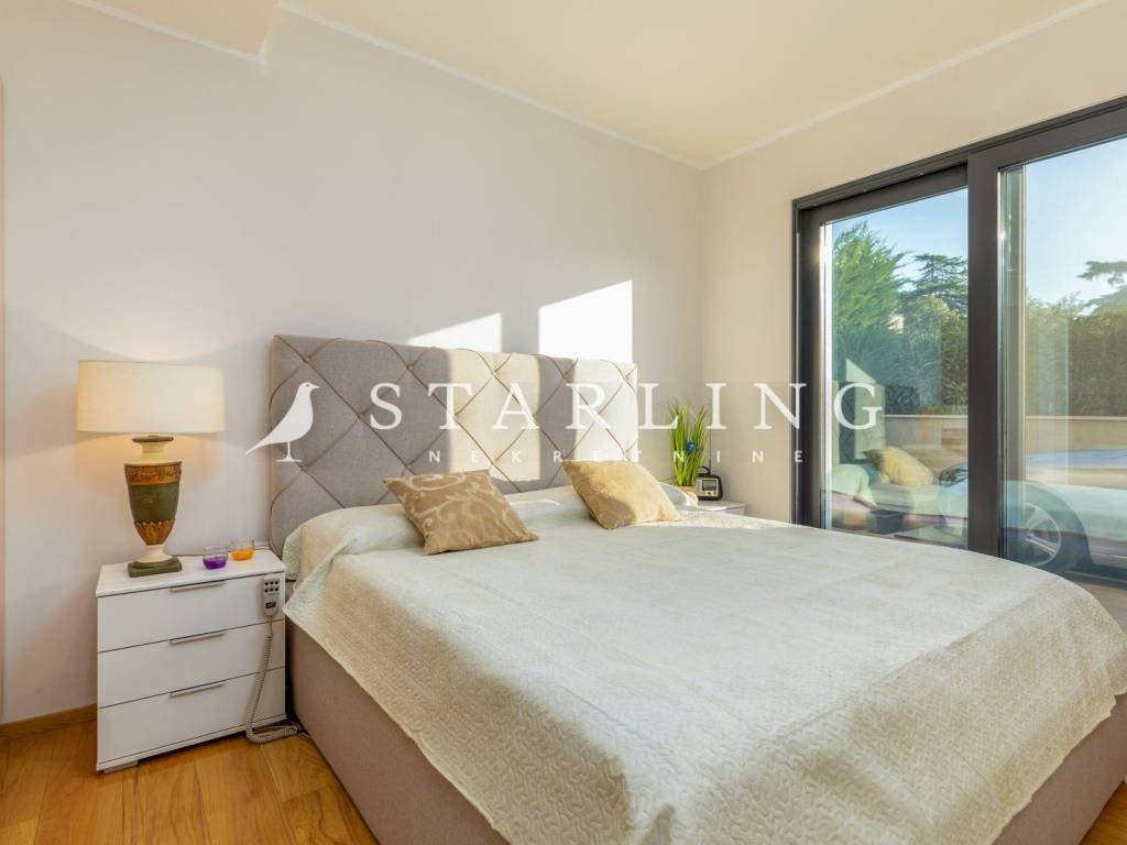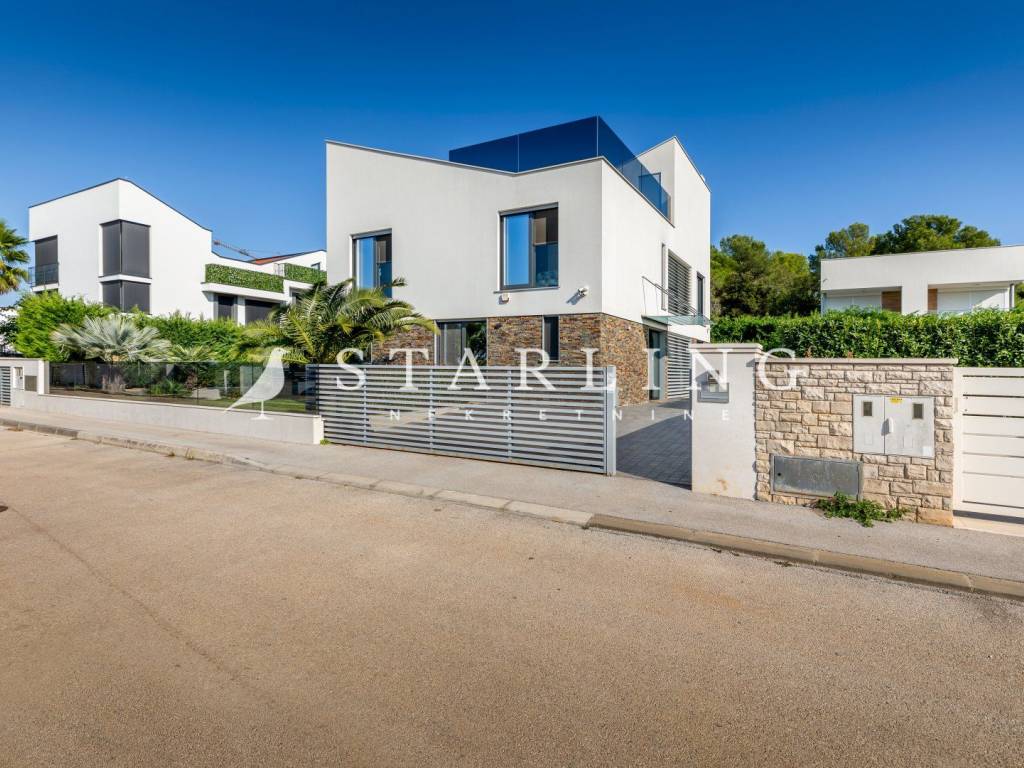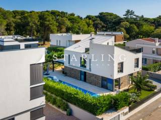 VILLA WITH SWIMMING POOL, SALE, FAŽANA, 300 m2 Luxury villa with swimming pool with a beautiful view of the sea, total living area of 300 m2, is located in a quiet location only 100 m from the sea and beautiful promenades, and 500 m from the city center. The villa is equipped with solar collectors on the roof, floor heating via heat pumps, each room is equipped with a fan-coil air conditioning system, a video surveillance system with motion sensors, remote opening of the entrance gate of the parking lot, and all windows are equipped with mosquito nets and electronic control of blinds. . All floors inside the villa are connected by an internal staircase and an elevator that enables unhindered movement for people with reduced mobility. In addition to the elevator, the width of all doors in the villa is also adapted for people with reduced mobility. The villa consists of: - GROUNDS: heated swimming pool with waterfall, geyser, hydro massage and colored lights, jacuzzi, parking for three vehicles, covered kitchen with barbecue and dining table, landscaped grass area. - BASEMENT: kitchen with dining table and fireplace, toilet, boiler room, pantry, laundry room - GROUND FLOOR: kitchen with a large island, living room with dining room, bedroom with private bathroom, toilet, exit from the living room to the outdoor terrace through a large glass wall. - FIRST FLOOR: four bedrooms with private bathrooms, access to the roof terrace. - ROOF TERRACES Parking: 3 parking spaces within the garden Orientation: South Heating/cooling: underfloor heating, fan-coil system. Price: 2,200,000 euros