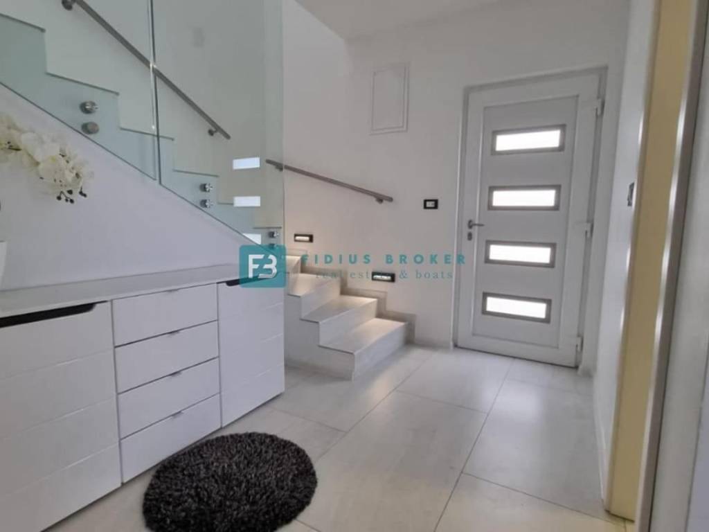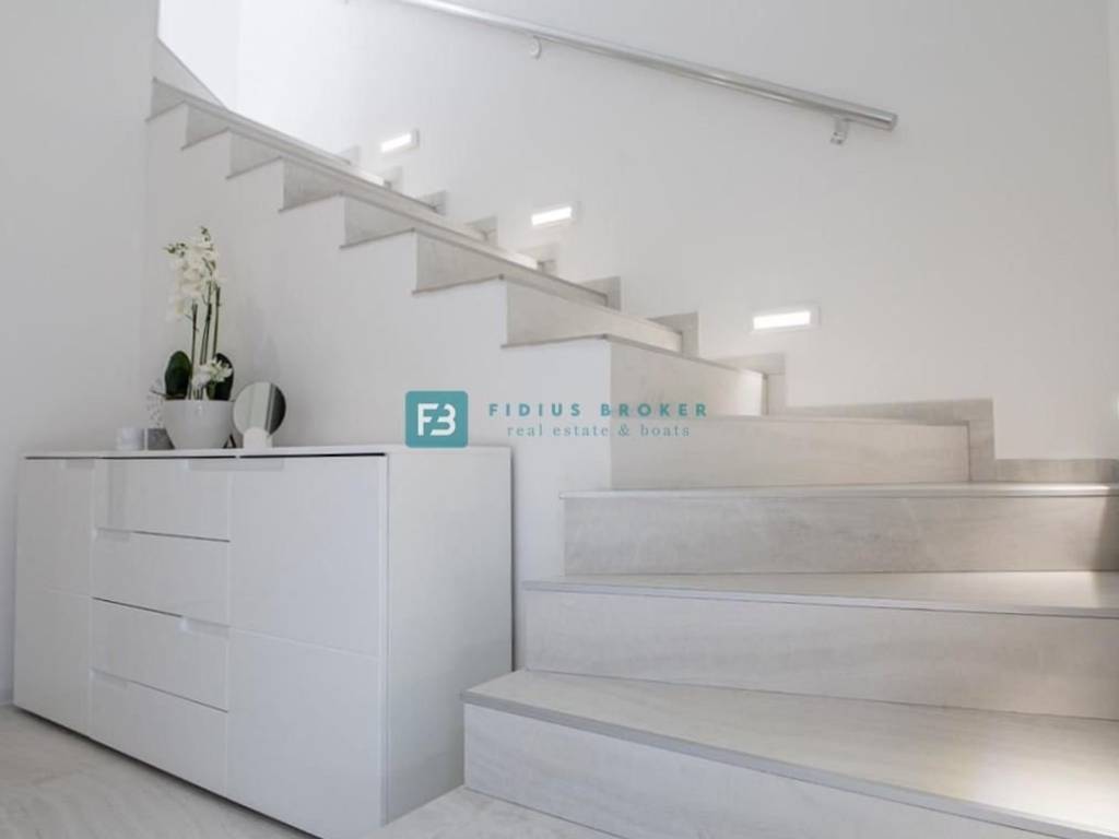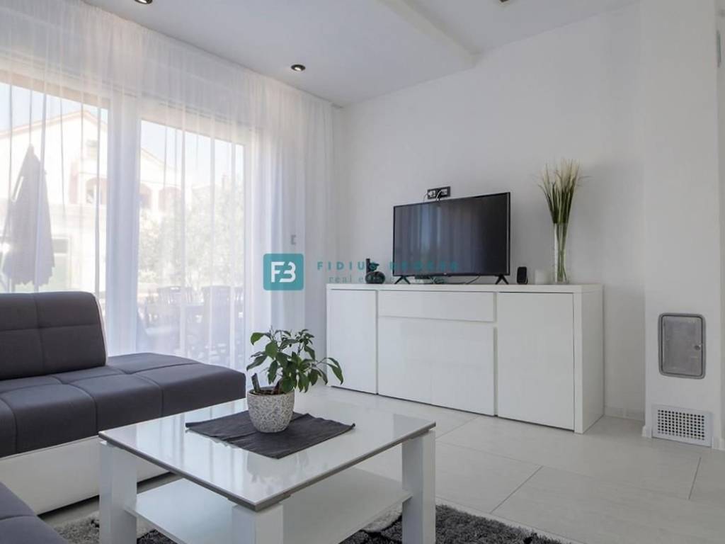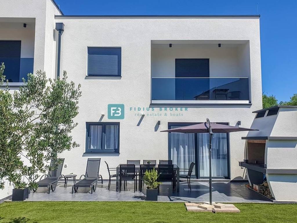 Die Wohnung mit modernem Design und funktionaler Aufteilung von 130 m2 erstreckt sich über zwei Etagen: Erdgeschoss + Obergeschoss. Im Erdgeschoss gibt es eine Küche mit Esszimmer, ein Schlafzimmer, ein geräumiges Wohnzimmer und ein Badezimmer. Vom Wohnzimmer und der Küche aus haben Sie Zugang zu einer überdachten Terrasse und einem angelegten Garten von 90 m2, wo es einen Außenbereich zum geselligen Beisammensein mit Sitzgelegenheiten und einem Grill gibt. Eine Innentreppe führt in den ersten Stock, wo sich drei geräumige Schlafzimmer, eine Toilette und ein Badezimmer befinden. Zwei Zimmer haben Zugang zum Balkon. Das Haus verfügt über einen Außenparkplatz.