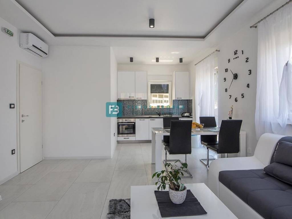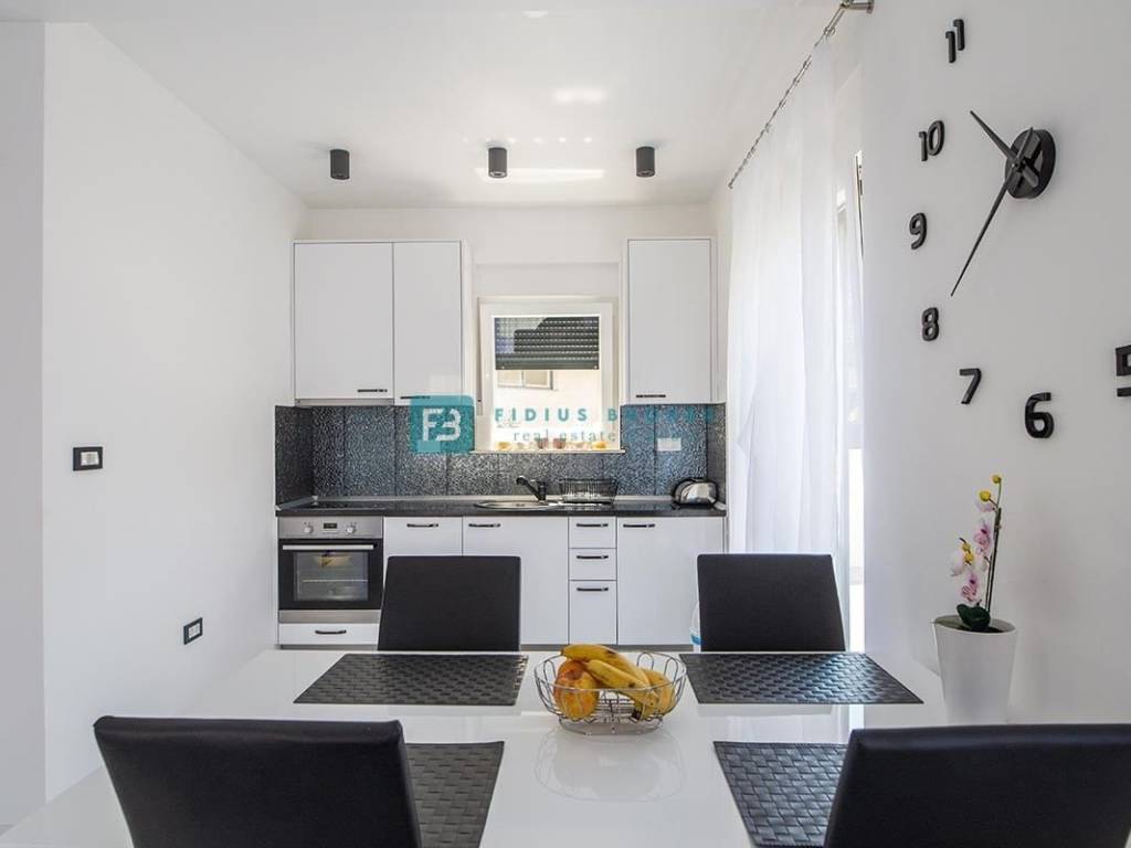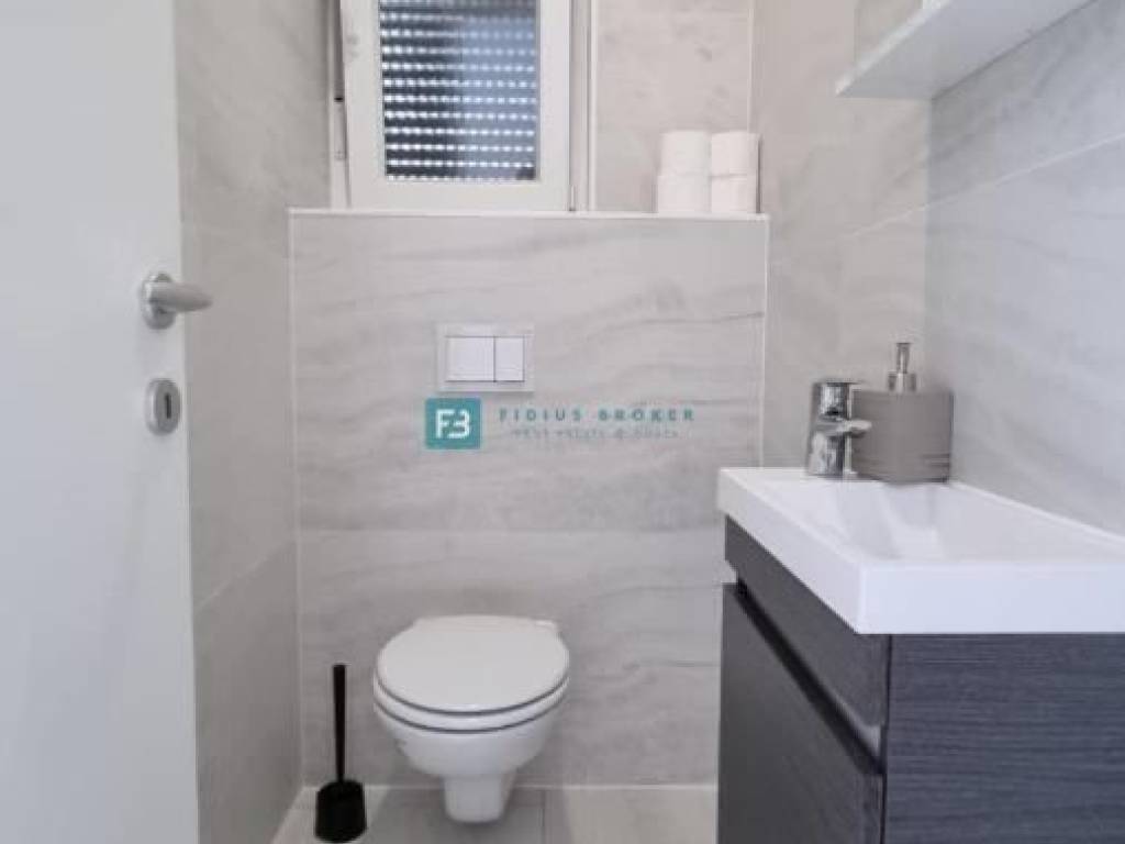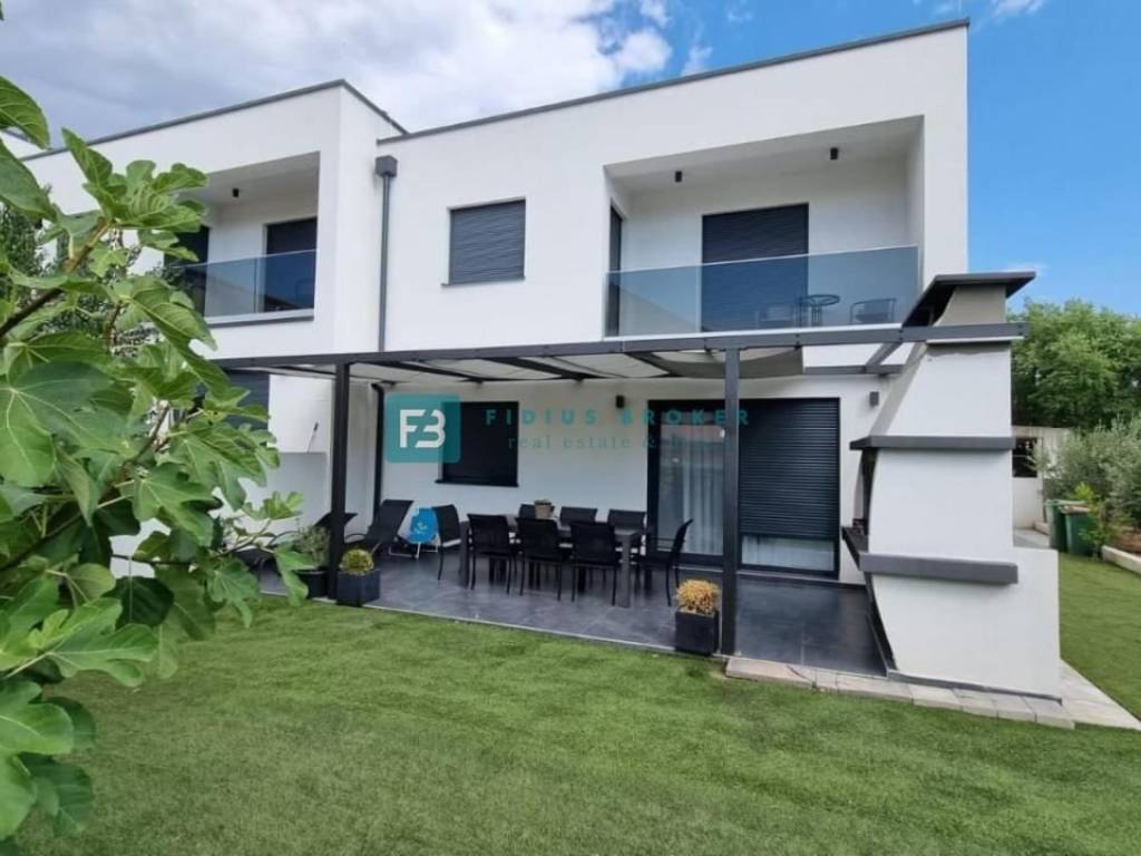 Die Wohnung mit modernem Design und funktionaler Aufteilung von 130 m2 erstreckt sich über zwei Etagen: Erdgeschoss + Obergeschoss. Im Erdgeschoss gibt es eine Küche mit Esszimmer, ein Schlafzimmer, ein geräumiges Wohnzimmer und ein Badezimmer. Vom Wohnzimmer und der Küche aus haben Sie Zugang zu einer überdachten Terrasse und einem angelegten Garten von 90 m2, wo es einen Außenbereich zum geselligen Beisammensein mit Sitzgelegenheiten und einem Grill gibt. Eine Innentreppe führt in den ersten Stock, wo sich drei geräumige Schlafzimmer, eine Toilette und ein Badezimmer befinden. Zwei Zimmer haben Zugang zum Balkon. Das Haus verfügt über einen Außenparkplatz.