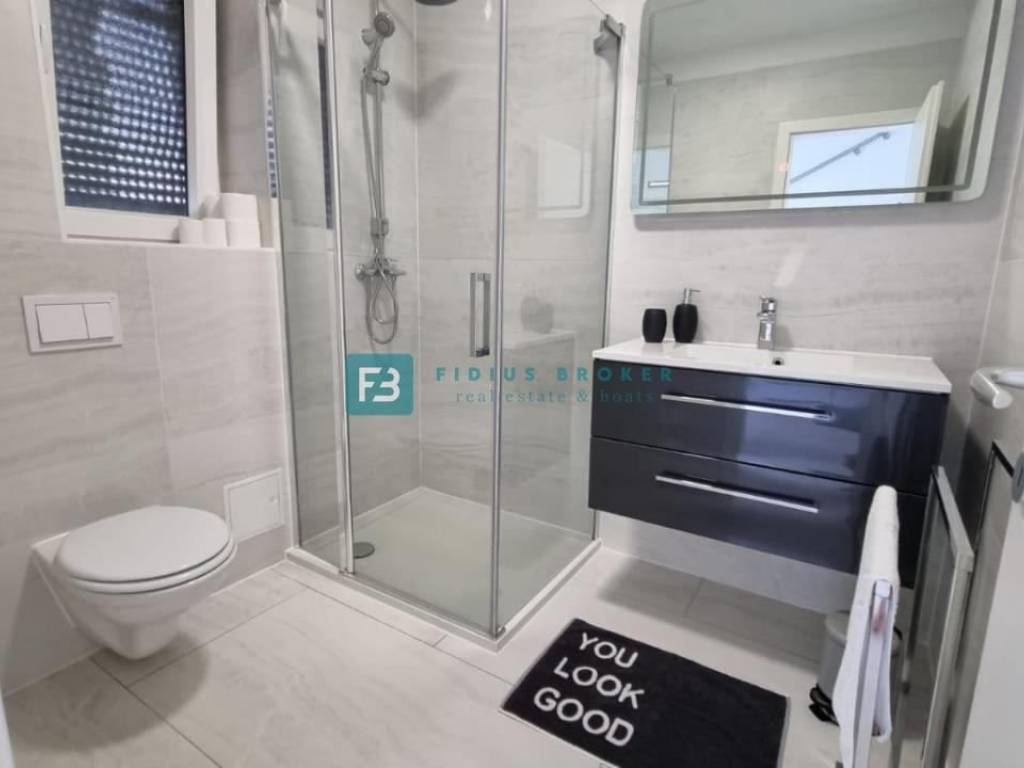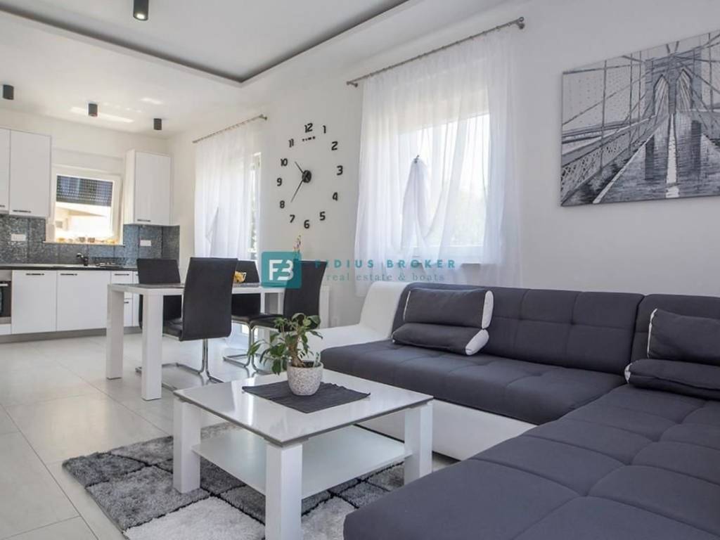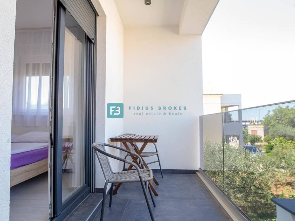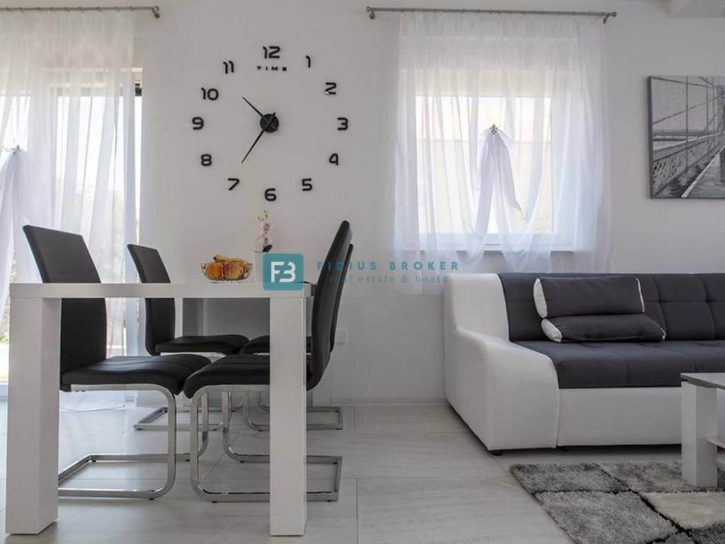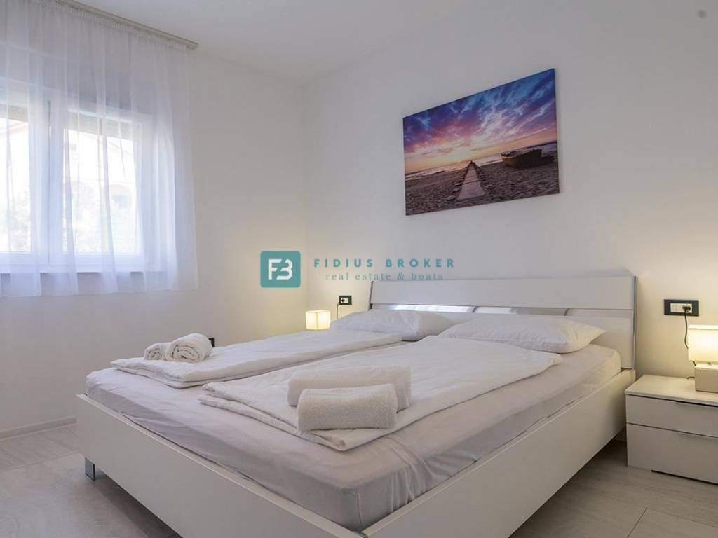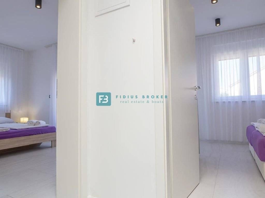 VODICE – Eine neu möblierte zweistöckige Wohnung mit Garten befindet sich in einem ruhigen Teil von Vodice, nur 650 m vom Stadtstrand und 900 m vom Stadtzentrum entfernt.