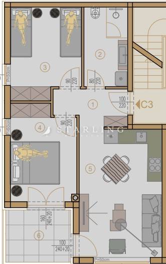 The apartment features a bright open-plan living room connected to the kitchen and dining area, two comfortable bedrooms, and a bathroom with underfloor heating. The functional layout provides a comfortable and practical living space, ideal for a family or a couple.