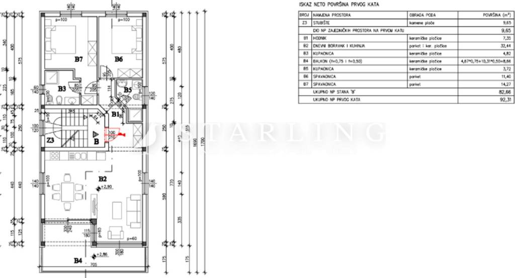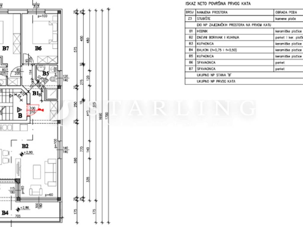 For sale is an apartment on the first floor of a high-quality new building with a total of three residential units, located in the quiet and attractive neighborhood of Mukalba in Medulin. The apartment is situated in the first construction row, directly next to a green zone where construction is prohibited, ensuring lasting peace, privacy, and an unobstructed view of nature and the sea. The apartment has a total net area of 88 m² and consists of two bedrooms, with the master bedroom featuring an en-suite bathroom, an additional bathroom, and an open space living room with a kitchen. The apartment opens onto a large terrace of 20 m², providing an ideal space for relaxation and outdoor enjoyment. It also includes two outdoor parking spaces located on the building's premises. The total net usable area is 88 m².
