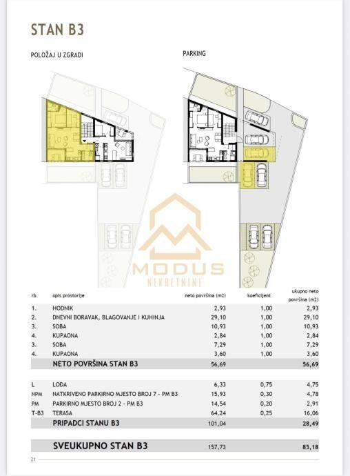 Stanu pripada i krovna terasa od 64.24 m2 i dva parking mjesta (Natkriveno i Otvoreno)