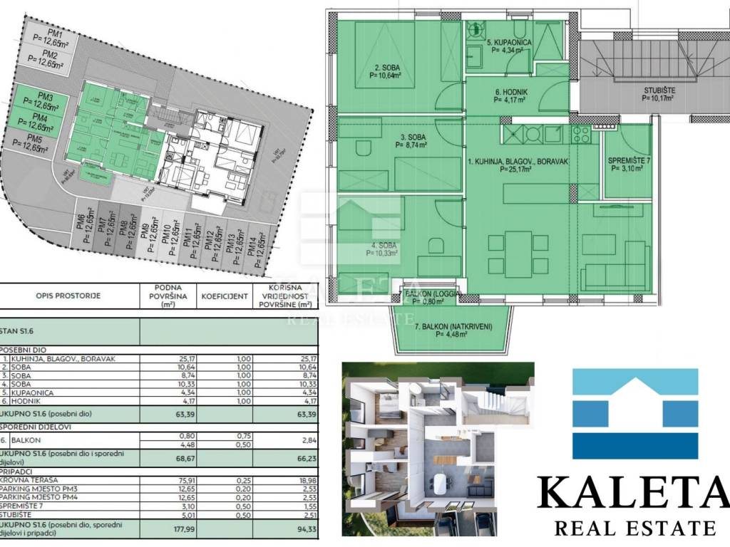 Die Wohnung verfügt über eine gesamte Nettofläche von 94,33 m² und befindet sich im zweiten Stock eines Gebäudes mit sechs Wohneinheiten. Die Wohnfläche umfasst 63,39 m² Innenraum, eine Terrasse von 5,28 m², einen Abstellraum von 3,10 m², eine große Dachterrasse mit 75 m² sowie zwei größere Stellplätze – insgesamt 177,99 m² tatsächliche Nutzfläche.