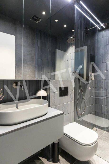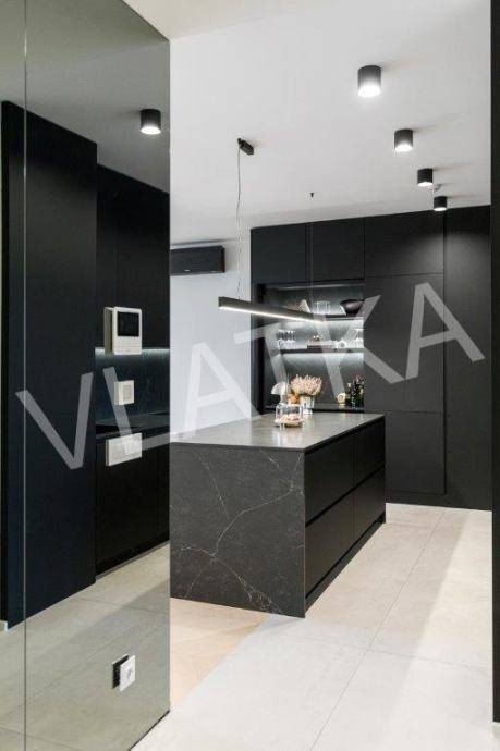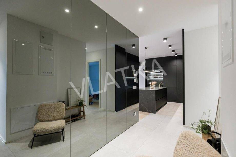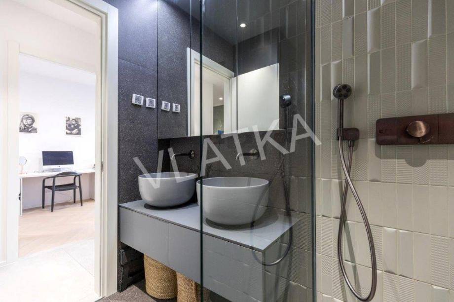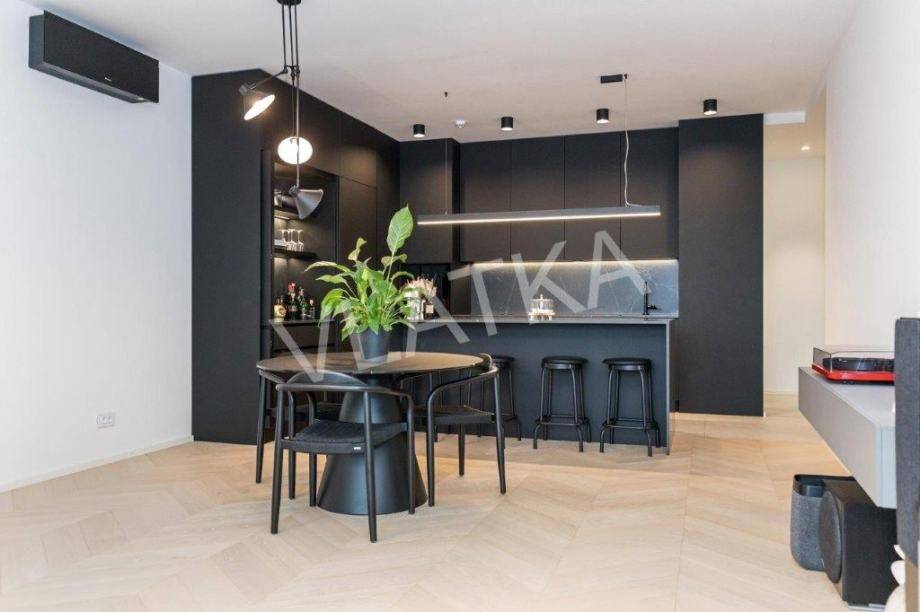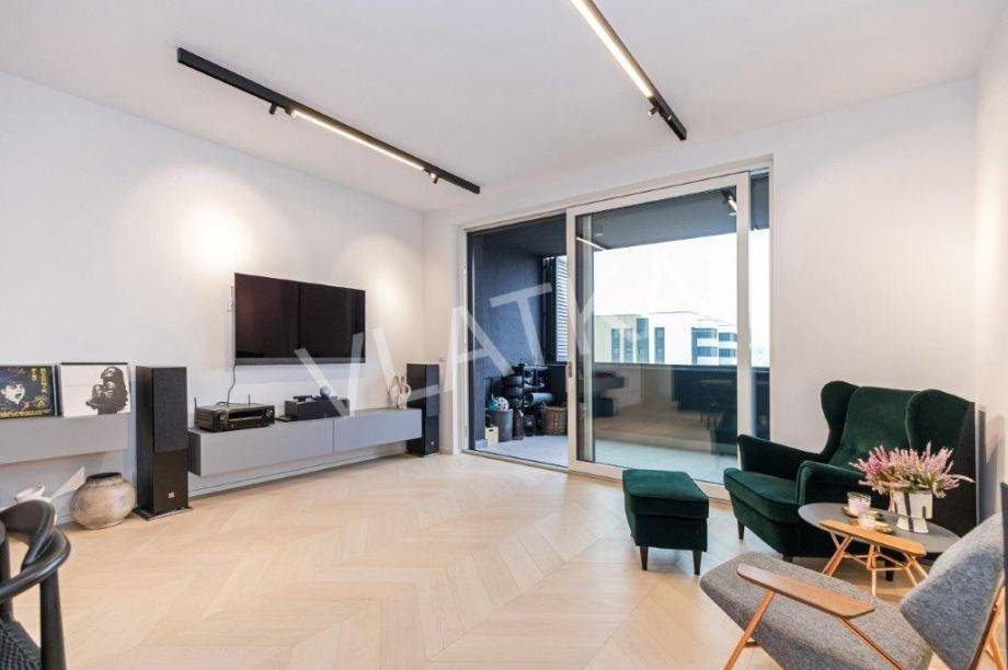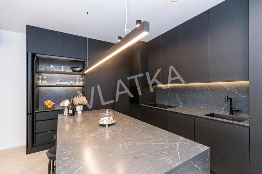 Daikin Black Emura-Klimaanlage (Fernbedienung) in allen Räumen, Fußbodenheizung Danfoss-Sonderregelung in allen Räumen (Fernbedienung), Badezimmer verfügen zusätzlich zur Wasser-Fußbodenheizung über eine zusätzliche elektrische Fußbodenheizung, Miele-Waschmaschine und -Trockner, Miele-Geschirrspüler, Knapić-Küche (Fenix-Material), eine Platte mit integrierter Dunstabzugshaube in der BORA-Kochfläche und einem Heißluftofen der professionellen Marke BORA, ein eingebauter Kühlschrank AEG, äußere Aluminium-Holz-Verbindung in der Farbe Anthrazit mit dreischichtigem IZO-Glas und Moskitonetze in allen Räumen, großformatiges Parkett (Chevron) in allen Räumen, mit Ausnahme des Flurs, eines Teils der Küche und der Loggia, wo hochwertige Keramik verlegt ist, die Installationen für die HiFi-Anlage Dolby Atmos sind verlegt , für die Frontlautsprecher zusätzlich hochwertige Kabel von New Color of Sound.