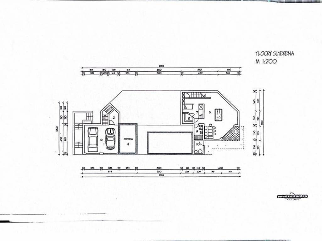 Im Untergeschoss mit einer Gesamtfläche von 129 m sind eine Garage, ein Abstellraum, eine Taverne, eine Zisterne, eine Sauna und ein Badezimmer geplant.