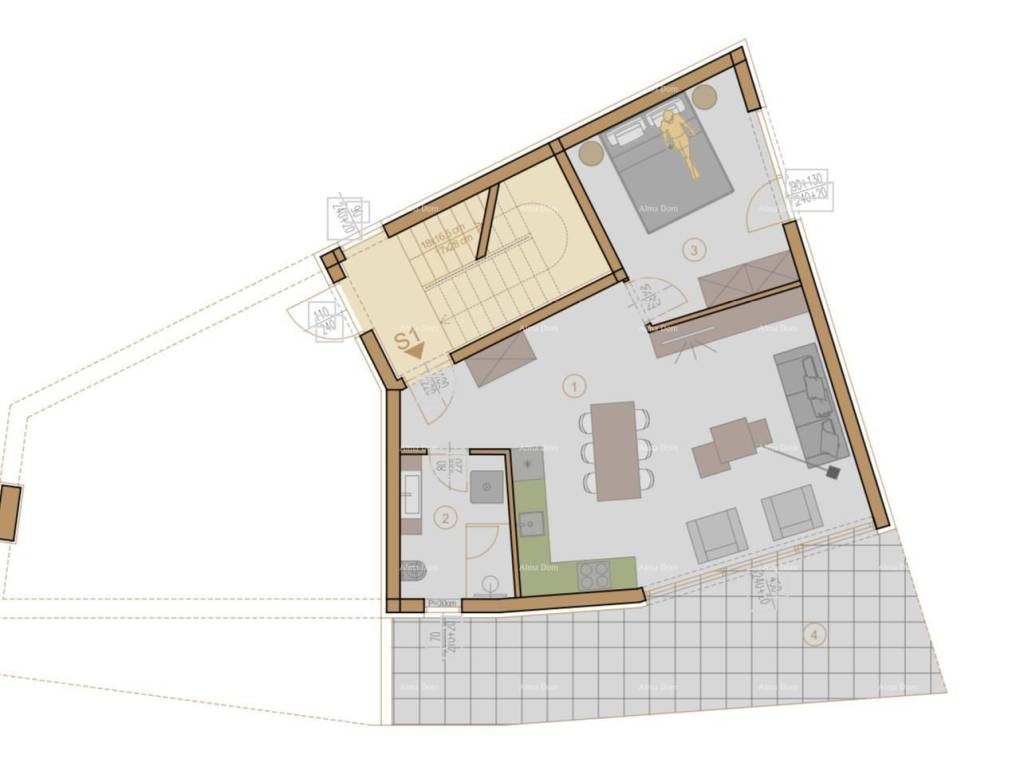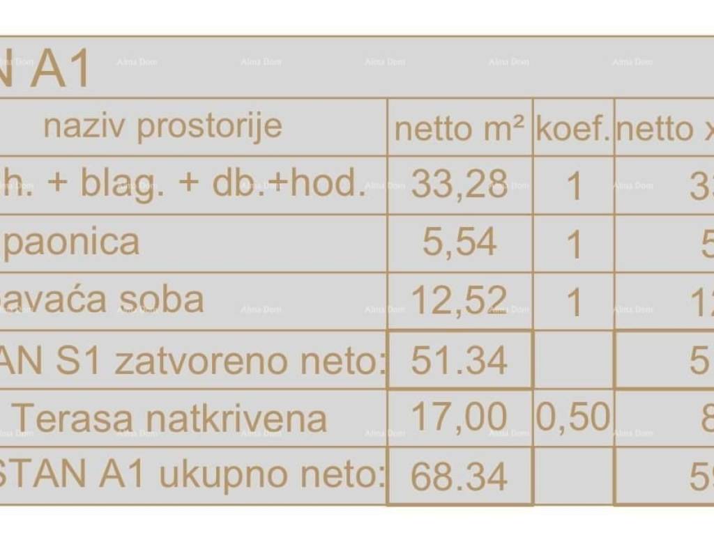 Modernes Wohnprojekt in Medulin – Tolle Lage!Ein modernes Wohnprojekt im Bau in Medulin besteht aus zwei Gebäuden mit jeweils drei Wohneinheiten.Wohnung A1 mit einer Fläche von 68,34 m² (Nettofläche 59,84 m²) befindet sich im Erdgeschoss von Gebäude A. Sie besteht aus einem Wohnzimmer mit Küche und Essbereich, 1 Schlafzimmer, 2 Badezimmern, einer überdachten Terrasse und einem Garten von 130,86 m² (Netto 13,8 m²).Zur Wohnung gehört ein Stellplatz, der zusätzlich bezahlt werden muss.Reservierungen sind jetzt möglich!Für weitere Informationen kontaktieren Sie bitte:Azra+385 91 611 5706+385 98 420 885azra@almadominvest.com
