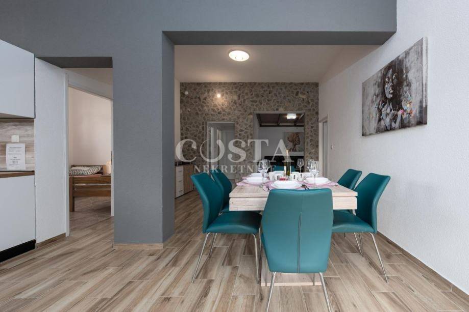 Zum Verkauf steht ein geräumiges Haus mit Pool und einer Wohnfläche von 600 m² auf einem 1.600 m² großen Grundstück im Dorf Donje Biljane, in ruhiger Lage unweit von Zadar. Das Anwesen besteht aus Keller, Erdgeschoss und zwei Obergeschossen. Der Keller erstreckt sich unter dem gesamten Haus, ist komplett aus Naturstein gebaut und als authentische Taverne eingerichtet – ideal für gesellige Treffen und kulinarische Veranstaltungen. Darüber befinden sich Erdgeschoss, erstes und zweites Obergeschoss. Im Erdgeschoss sowie in jedem der beiden Obergeschosse befinden sich drei voll ausgestattete Dreizimmerwohnungen. Jede Wohnung verfügt über drei Schlafzimmer, ein Badezimmer, eine große Küche, ein Wohnzimmer, Klimaanlage und eine geräumige Terrasse.
