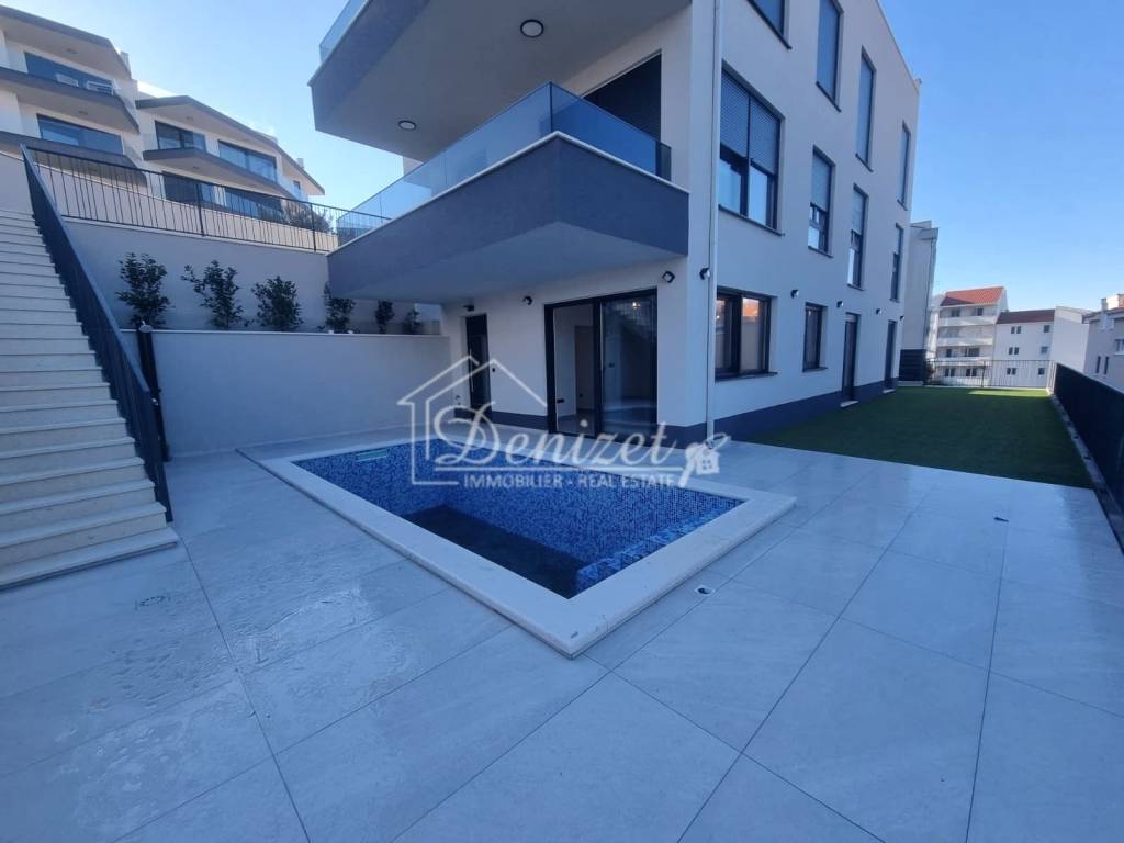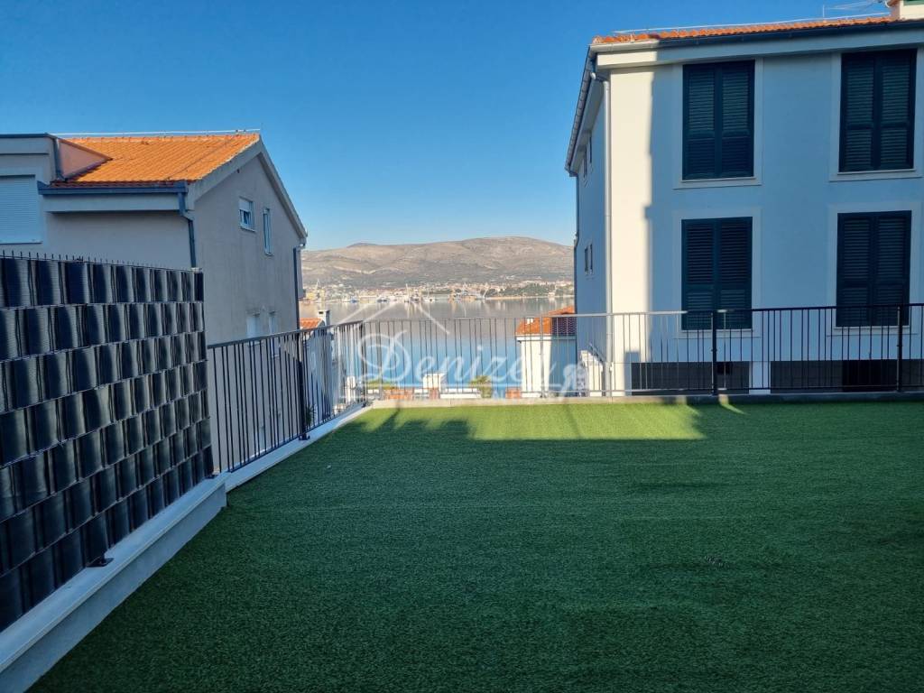 Die Immobilie ist mit Fußbodenheizung, Klimaanlagen in allen Räumen, elektrischen Rollläden, hochwertiger Aluminiumtischlerei, moderner Keramik sowie hochwertigen Sanitäreinrichtungen ausgestattet, was ein hohes Maß an Komfort und Wohnqualität gewährleistet. Die Wohnung wird in Kürze möbliert und wird auch so verkauft. Sie befindet sich in ausgezeichneter Lage, nur 150 Meter vom Meer und dem nächstgelegenen Strand entfernt sowie in der Nähe aller wichtigen Einrichtungen für den täglichen Bedarf. Die Entfernung zur Stadt Trogir beträgt 4,5 km, zum Flughafen Split 10 km, während das Stadtzentrum von Split 33 km entfernt ist.