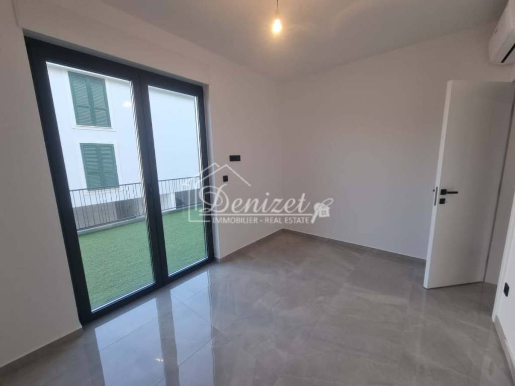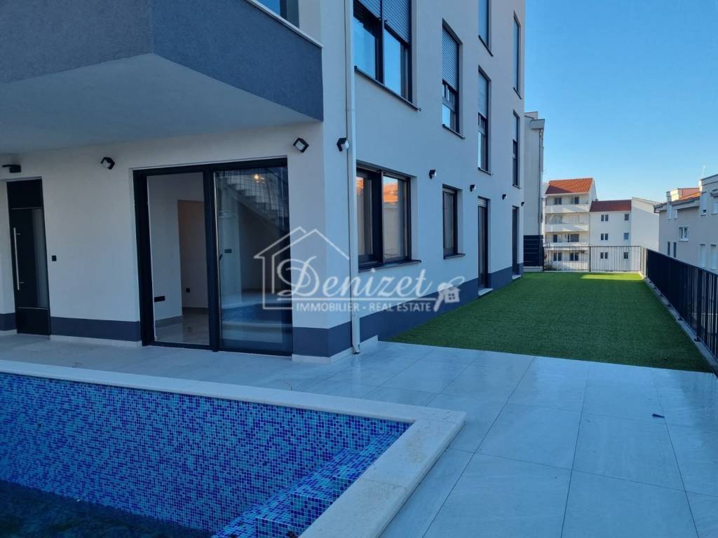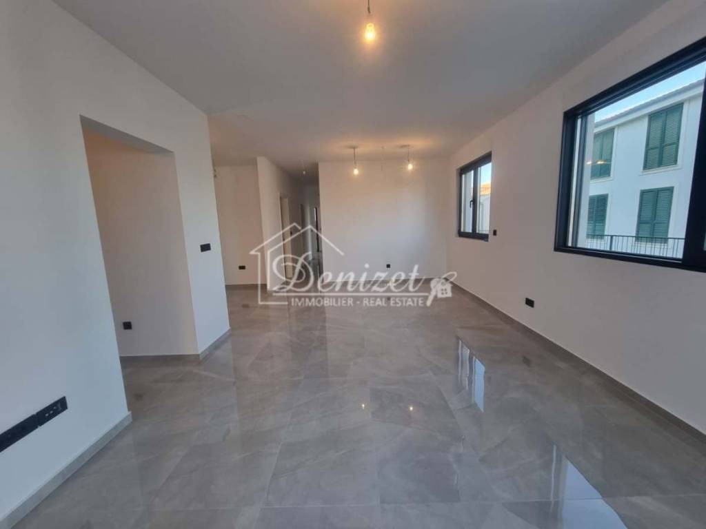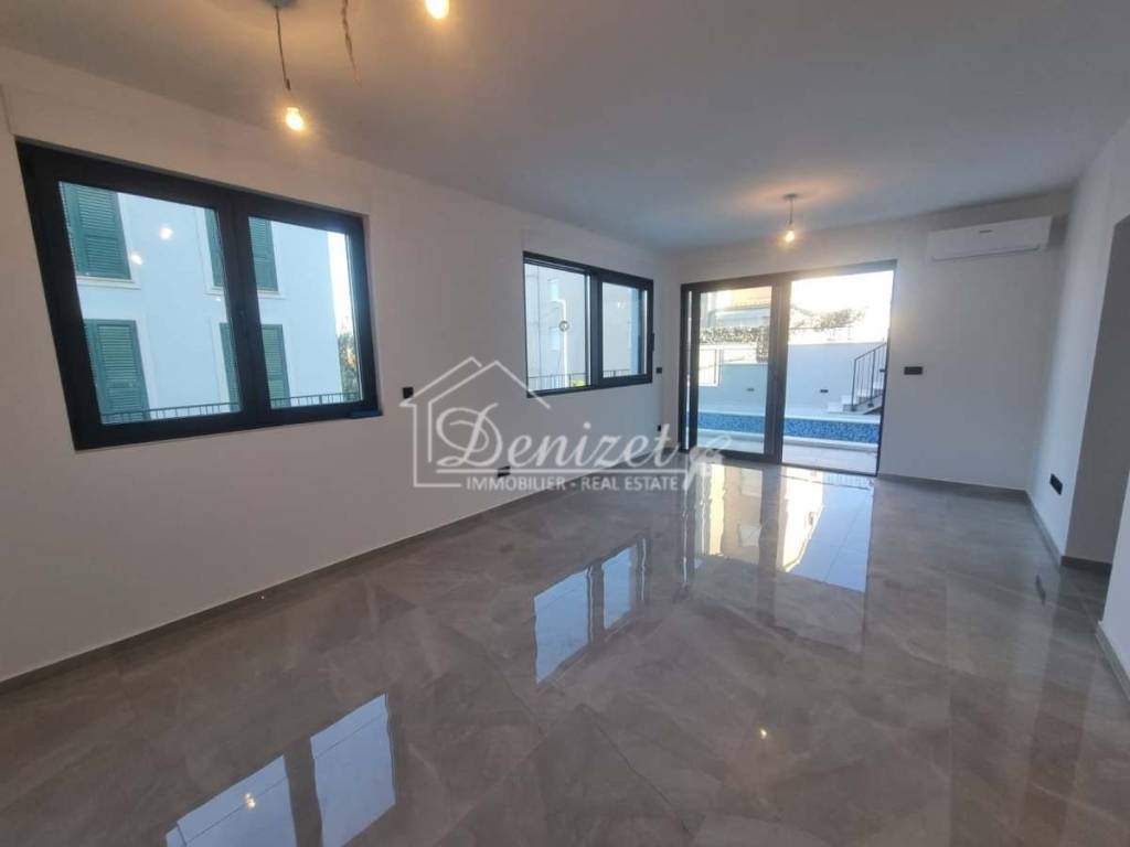 Die Wohnung befindet sich im Untergeschoss, wirkt jedoch aufgrund der erhöhten Lage des Gebäudes wie ein Hochparterre. Sie besteht aus einem Wohnzimmer, einem Essbereich, einer Küche, einem Flur, drei Schlafzimmern und zwei Badezimmern mit einer gesamten Wohnfläche von 80,08 m². Von der Wohnung aus gelangt man auf eine großzügige gepflasterte Terrasse von 45 m² sowie in einen Garten mit einer Fläche von 101,57 m². Auf der Terrasse befindet sich zudem ein privater Pool mit 14,24 m². Von der Terrasse aus bietet sich ein Meerblick. Zur Wohnung gehören zwei Außenstellplätze.