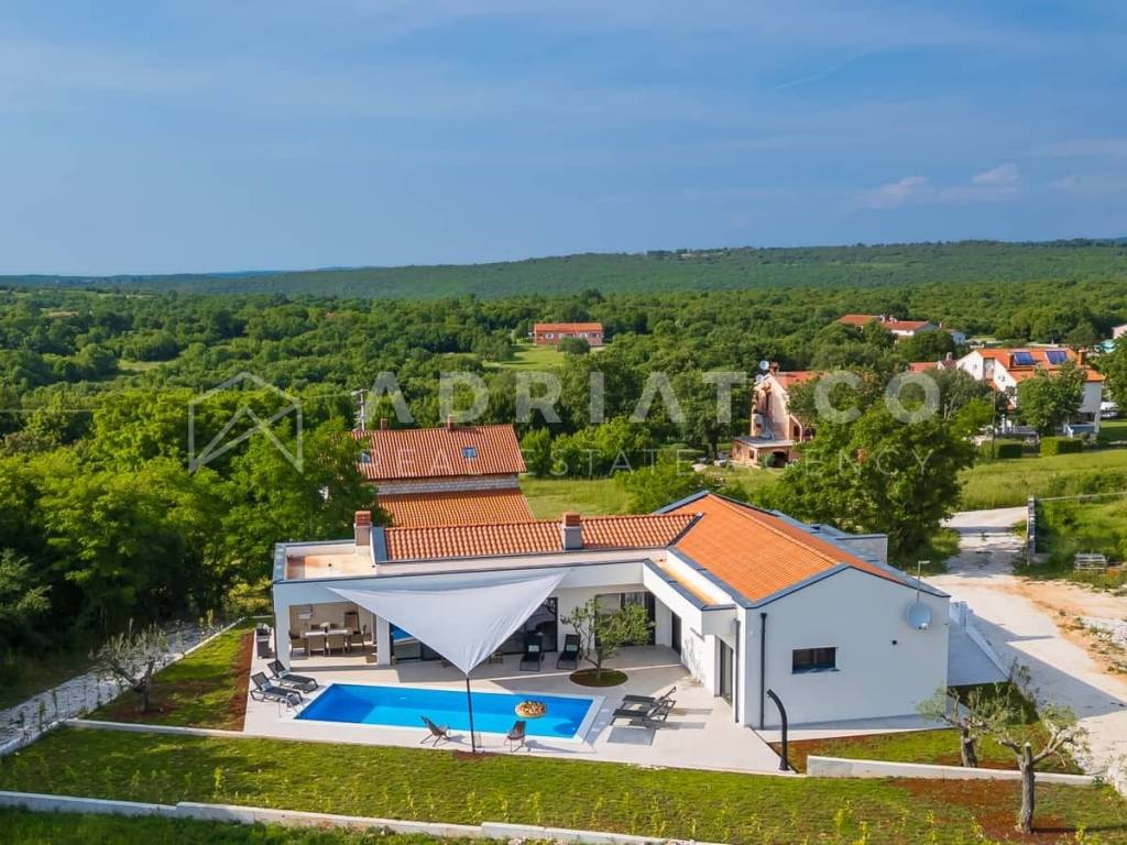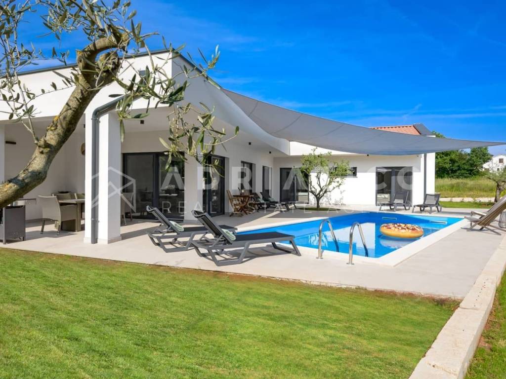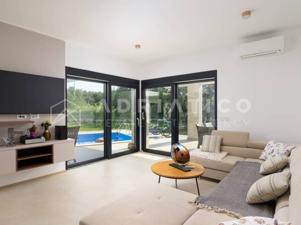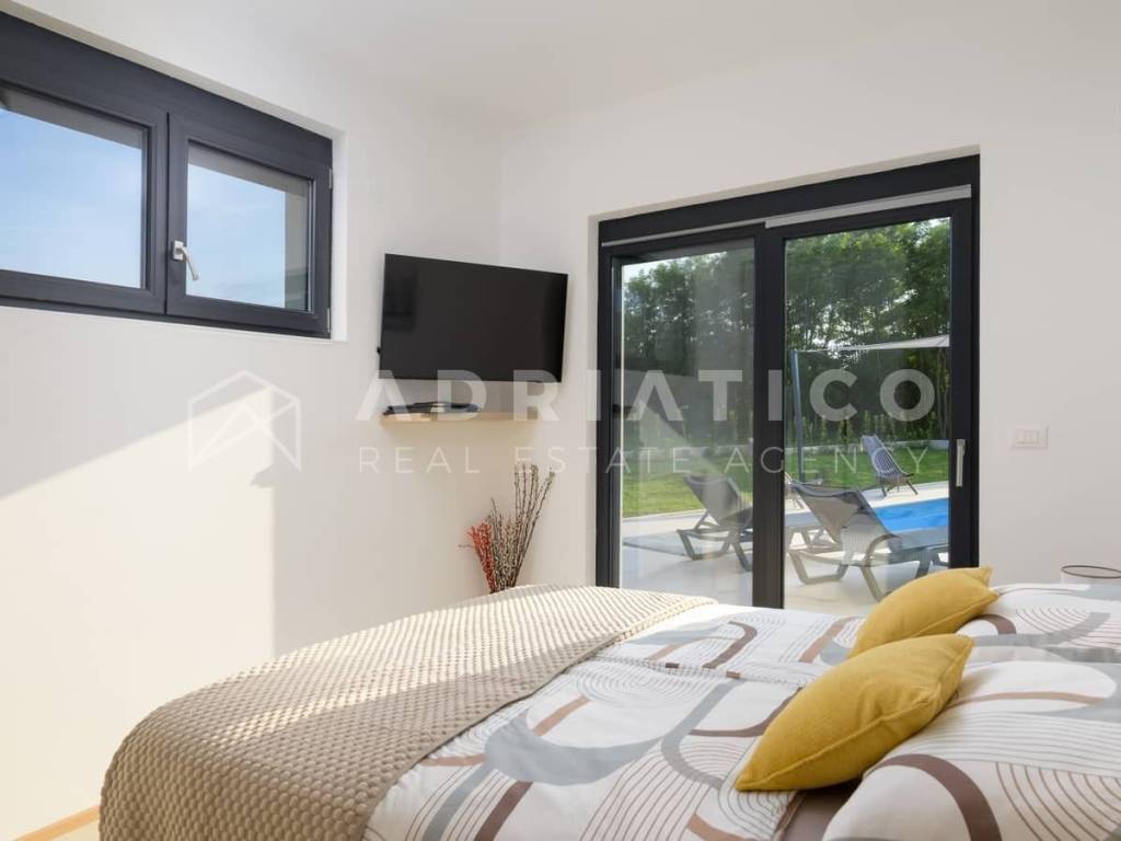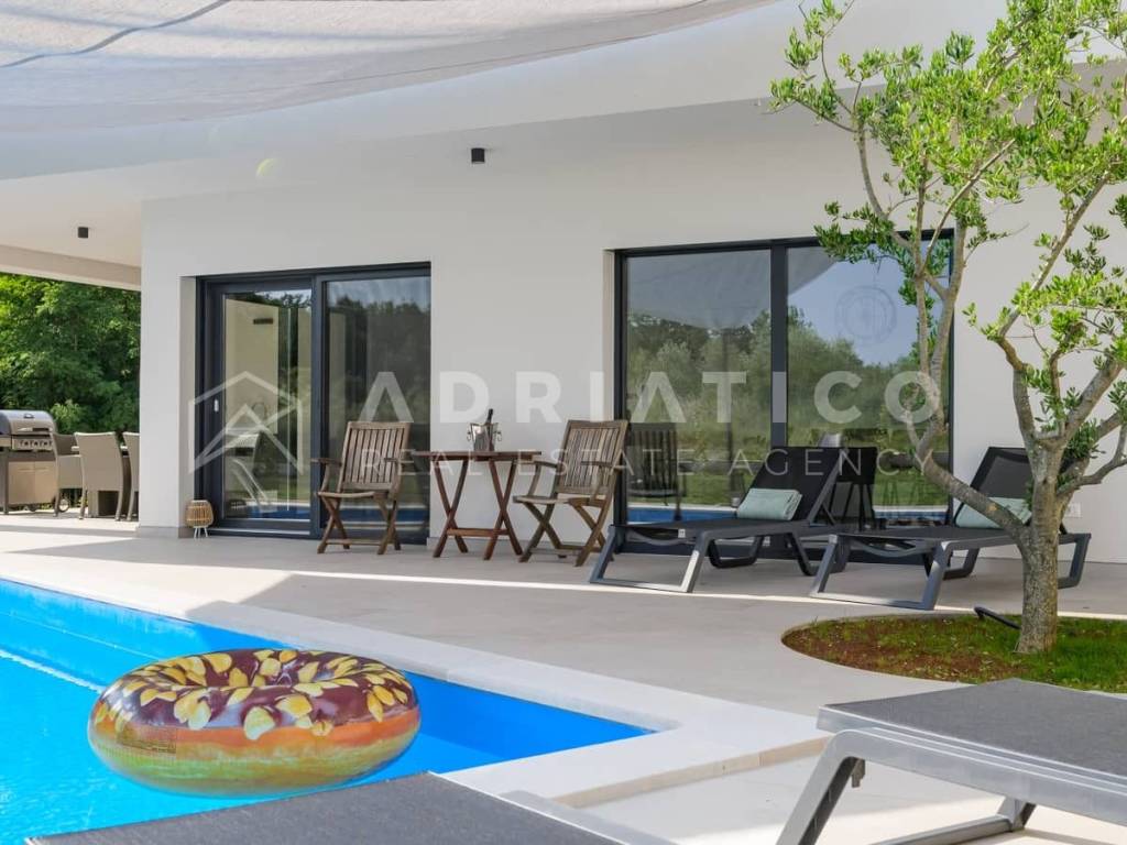Rovinj Umgebung, Istrien Moderne Neubau-Bungalowvilla mit Pool in ruhiger Lage In einer ruhigen und grünen Umgebung nahe Rovinj, nur 10 km vom Stadtzentrum und wenige Autominuten von allen wichtigen Einrichtungen entfernt, steht dieser hochwertige Neubau-Bungalow mit Swimmingpool zum Verkauf ideal zum Wohnen oder als renditestarke Investition im Tourismus. Das Haus befindet sich auf einem 549 m großen, gepflegten Grundstück und verfügt über ca. 140 m Wohnfläche, die funktional und komfortabel gestaltet ist. Die Südwest-Ausrichtung sorgt für viel Tageslicht, während die Lage am Waldrand Ruhe und Privatsphäre bietet. Der Grundriss umfasst einen Eingangsbereich, Flur, drei Schlafzimmer, zwei moderne Badezimmer, einen Abstellraum sowie einen großzügigen offenen Wohnbereich mit Küche und Esszimmer mit Zugang zur überdachten Terrasse mit Außenküche. Für ganzjährigen Wohnkomfort sorgen Fußbodenheizung im gesamten Haus sowie hochwertige Klimaanlagen. Der eingezäunte Garten ist mediterran bepflanzt und verfügt über einen großen Pool mit Sonnenterrasse, ideal zur Eigennutzung oder touristischen Vermietung. Große Glasfronten verbinden Innen- und Außenbereich harmonisch. Das Haus wird vollständig möbliert verkauft und ist sofort bezugs- oder vermietbereit.