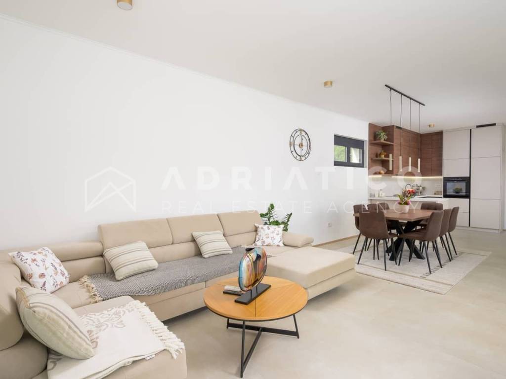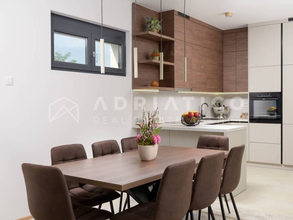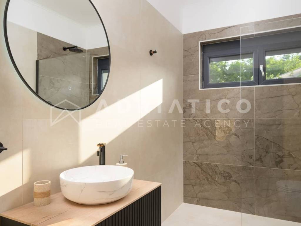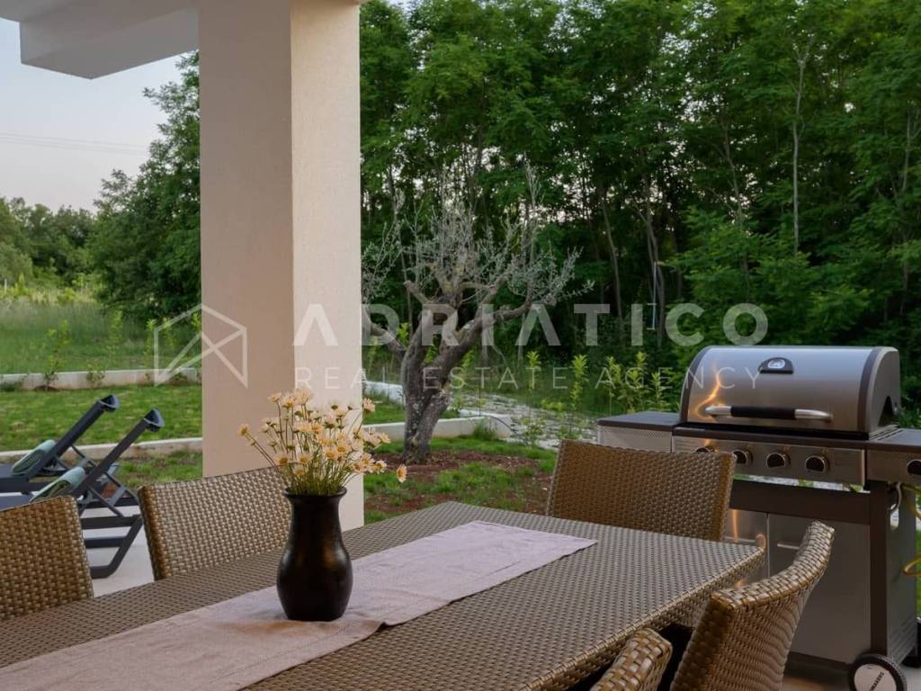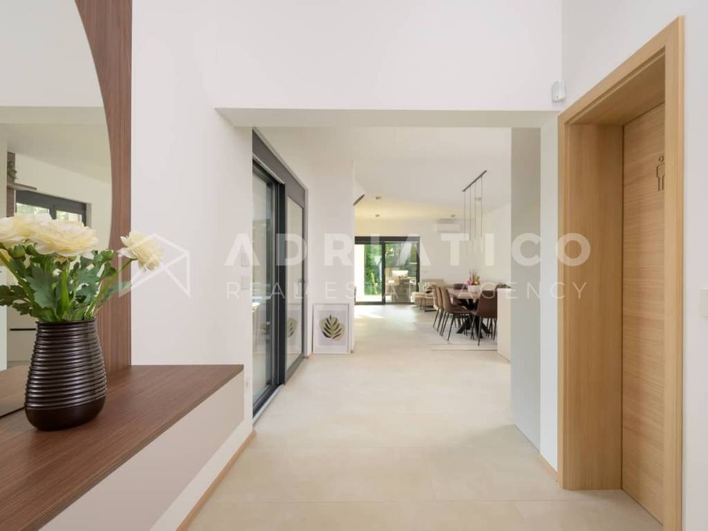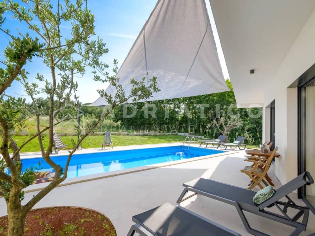 Rovinj Umgebung, Istrien Moderne Neubau-Bungalowvilla mit Pool in ruhiger Lage In einer ruhigen und grünen Umgebung nahe Rovinj, nur 10 km vom Stadtzentrum und wenige Autominuten von allen wichtigen Einrichtungen entfernt, steht dieser hochwertige Neubau-Bungalow mit Swimmingpool zum Verkauf ideal zum Wohnen oder als renditestarke Investition im Tourismus. Das Haus befindet sich auf einem 549 m großen, gepflegten Grundstück und verfügt über ca. 140 m Wohnfläche, die funktional und komfortabel gestaltet ist. Die Südwest-Ausrichtung sorgt für viel Tageslicht, während die Lage am Waldrand Ruhe und Privatsphäre bietet. Der Grundriss umfasst einen Eingangsbereich, Flur, drei Schlafzimmer, zwei moderne Badezimmer, einen Abstellraum sowie einen großzügigen offenen Wohnbereich mit Küche und Esszimmer mit Zugang zur überdachten Terrasse mit Außenküche. Für ganzjährigen Wohnkomfort sorgen Fußbodenheizung im gesamten Haus sowie hochwertige Klimaanlagen. Der eingezäunte Garten ist mediterran bepflanzt und verfügt über einen großen Pool mit Sonnenterrasse, ideal zur Eigennutzung oder touristischen Vermietung. Große Glasfronten verbinden Innen- und Außenbereich harmonisch. Das Haus wird vollständig möbliert verkauft und ist sofort bezugs- oder vermietbereit.