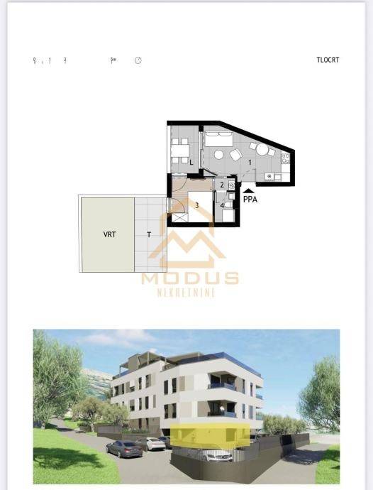 Sastoji se od unutarnjeg prostora veličine 26.57 m2 + terasa 10.08 m2 + lođa 5.61 m + vrt 18.41 m2 + Garažno + parking mjesto.