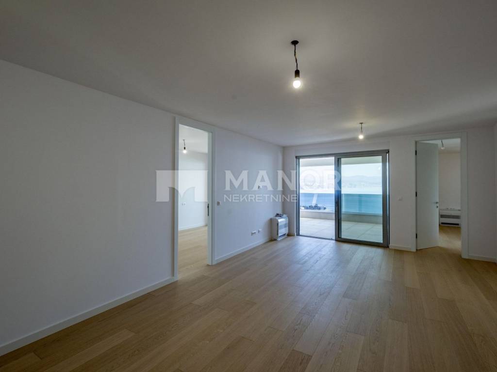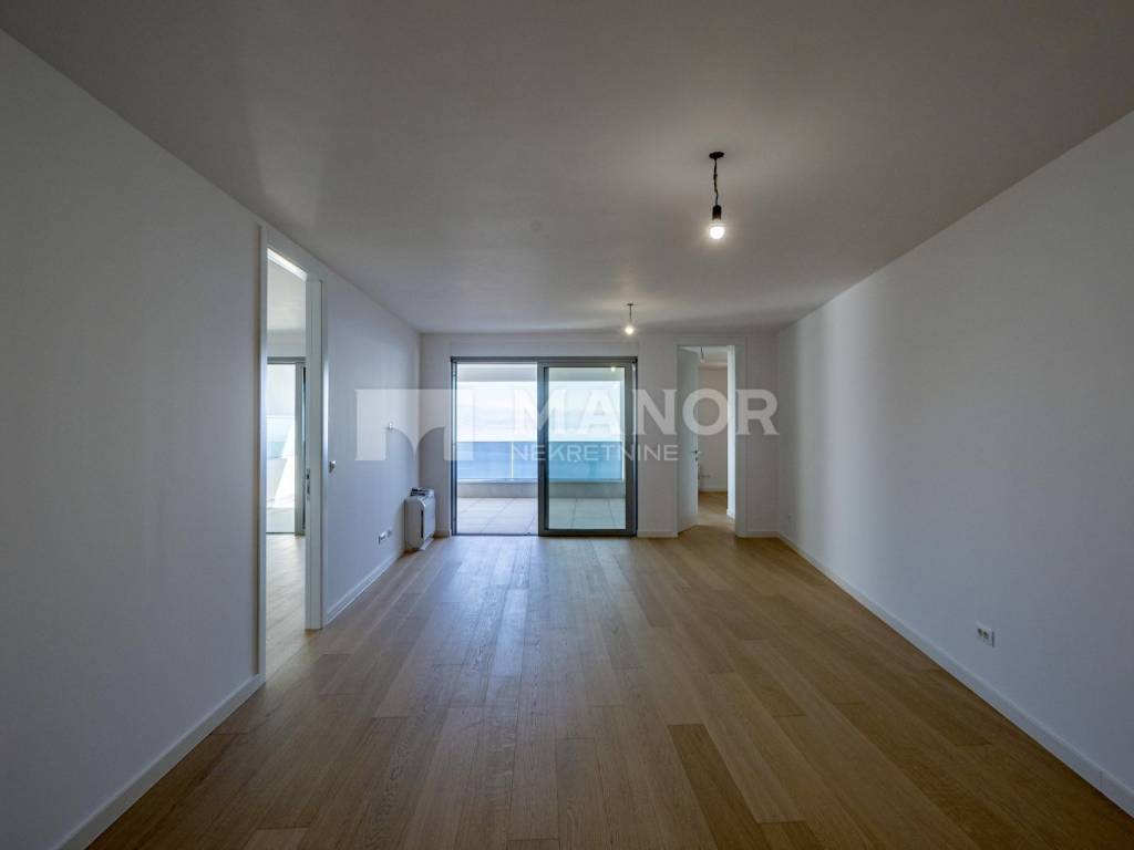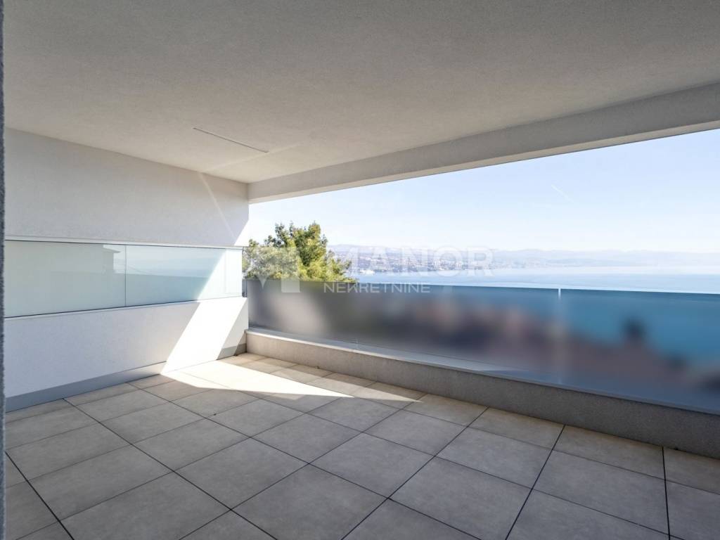 Die Wohnung besteht aus zwei Schlafzimmern, jeweils mit eigenem Bad, einem Gäste-WC sowie einem offenen Wohn-, Ess- und Küchenbereich. Vom Wohn- und Essbereich gelangt man auf eine große Terrasse mit herrlichem Panoramablick auf die gesamte Kvarner Bucht. Zur Wohnung gehören zwei Parkplätze, einer davon in der Garage, mit trockenem Zugang per Aufzug direkt von der Garage zur Wohnung. Die Bewohner haben außerdem Zugang zu einem Gemeinschaftspool. Beim Bau wurden hochwertigste Materialien und modernste Technologie verwendet. Schüco-Aluminiumfenster mit großen Schiebetüren wurden installiert, die viel natürliches Licht und ungestörte Meersicht ermöglichen. Die Böden sind mit erstklassigem Parkett ausgelegt, die Bäder und die Küche sind mit italienischer Keramik und Sanitäranlagen ausgestattet. Die Immobilie verfügt zudem über elektrische Rollläden, Sicherheitseingangstüren, ein Fan-Coil Heiz- und Kühlsystem sowie Fußbodenheizung in den Bädern.