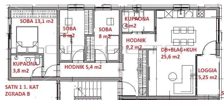 Primamo rezervacije za stan u novogradnji. Manja zgrada sa samo 4 stana. Stan se sastoji od " open space" dnevnog boravka, blagovaonice i kuhinje s izlazom na loggiu, tri sobe i kupaonice s wc-om. Trostrane je orijentacije.U cijeni je garaža, vanjsko parkirno mjesto i spremište od 7,5m2. Odlična lokacija na par minuta pješaćke udaljenosti od osnovne škole, trgovine i autobusne stanice, kao i do svih ostali sadržaja važnih za ugodan život. Useljenje 11/2026.