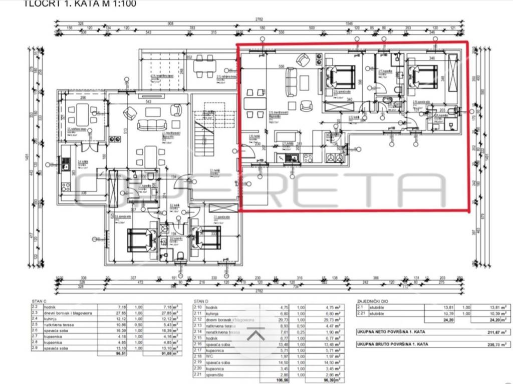 Apartment A-D, im ersten Stock des Gebäudes gelegen, mit einer Gesamtfläche von 96,39 m2. Es besteht aus einem Flur, einem Badezimmer, zwei Schlafzimmern, eines davon mit eigenem Bad, einer Küche und einem Wohnzimmer mit Essbereich. Vom Wohnzimmer aus hat man Zugang zur Terrasse.