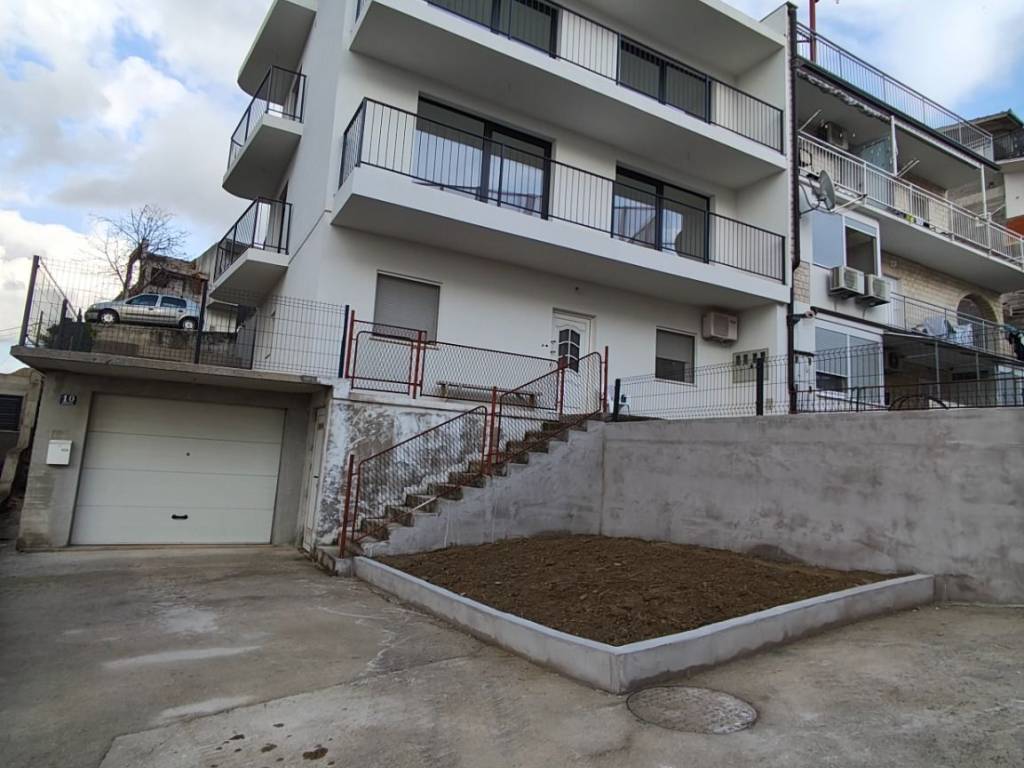 Kuća ima novu fasadu s termo izolacijom od kamene vune, orijentacija kuće je jug-zapad-istok, raspored stanova na 1. i 2. katu su identični, sastoje se od 2.spavaće sobe, kupatila s podnim grijanjem, WC, dnevni boravak s podnim grijanjem i kuhinje s blagovaonicom, te natkrivenim balkonom s južne i zapadne strane s kojih puca pogled na kaštelanski zaljev, more i planinu Kozjak. Prodaju se ne namješteni.