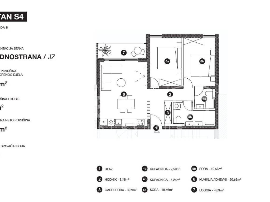 Die Wohnung befindet sich im ersten Stock und besteht aus zwei Schlafzimmern, einem Wohnzimmer mit Küche, zwei Badezimmern, einem Flur mit Garderobe und einer Loggia.