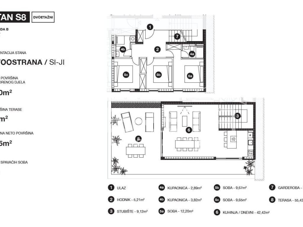 Im zweiten Stock gelegen, besteht sie aus drei Schlafzimmern, einem Wohnzimmer mit Küche, zwei Bädern, einem Flur mit Garderobe, einer Treppe und einer Terrasse.