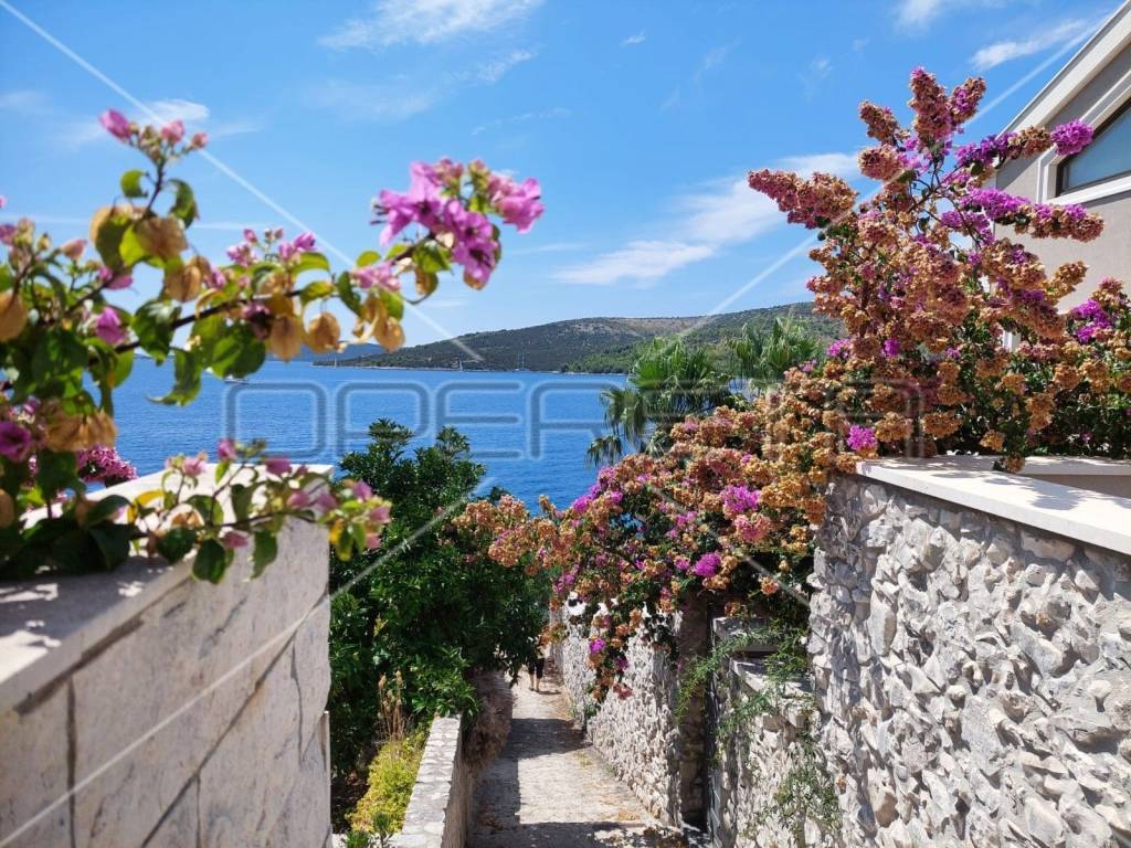 Die renovierte Villa im mediterranen Stil befindet sich in unmittelbarer Nähe zum Meer. Die Villa besteht aus drei komfortablen Zweizimmerwohnungen, die komplett mit neuen, neoklassischen Möbeln und Geräten ausgestattet sind. Jede Wohnung besteht aus einem Wohnzimmer mit Küche und Esszimmer, einem Schlafzimmer, einem Badezimmer und einem Abstellraum. Jedes Apartment verfügt über einen Balkon und/oder eine Terrasse mit idyllischem Blick auf die umliegenden Gewässer – die Halbinsel Vinišće, die Insel Čiovo und die Marin-Bucht. Die Villa ist von Olivenbäumen und verschiedenen mediterranen Pflanzen umgeben und liegt in einem großen, angelegten Garten, der in mehrere kaskadenförmige Terrassen unterteilt ist, die mit Liegestühlen und Außenduschen, einer Bar und einem Grill ausgestattet sind.
