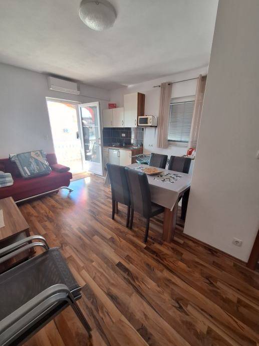 Smješten u polukatu visoko prizemlje vlastito stpenište prema ulazu. Jednosobni apartman sastoji se od kuhinja dnevni boravak veliki prostor open space princip, jedna spavaća soba, kupatilo i terasa ukupno 45m² stambenog prostora. Klimatizirano. Apartmanu pripada parkirno mjesto.