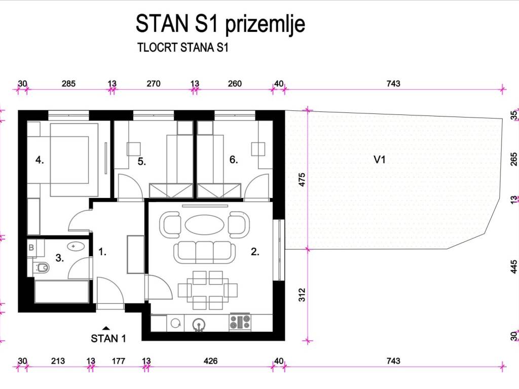 - Kuhinja, blagovaonica, dnevni boravak površine od 18,74m2
