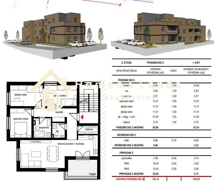 4-soban stan oznake S2 na prvom katu zgrade MF1 ukupne korisne površine 126,34m2(100,59)m2 obračunske površine) sastoji se od hodnika,kuhinje s blagovaonicom,dnevnog boravka,tri spavaće sobe,dvije kupaonice,loggie,ostave, velikog spremišta i 2 parkinga.
