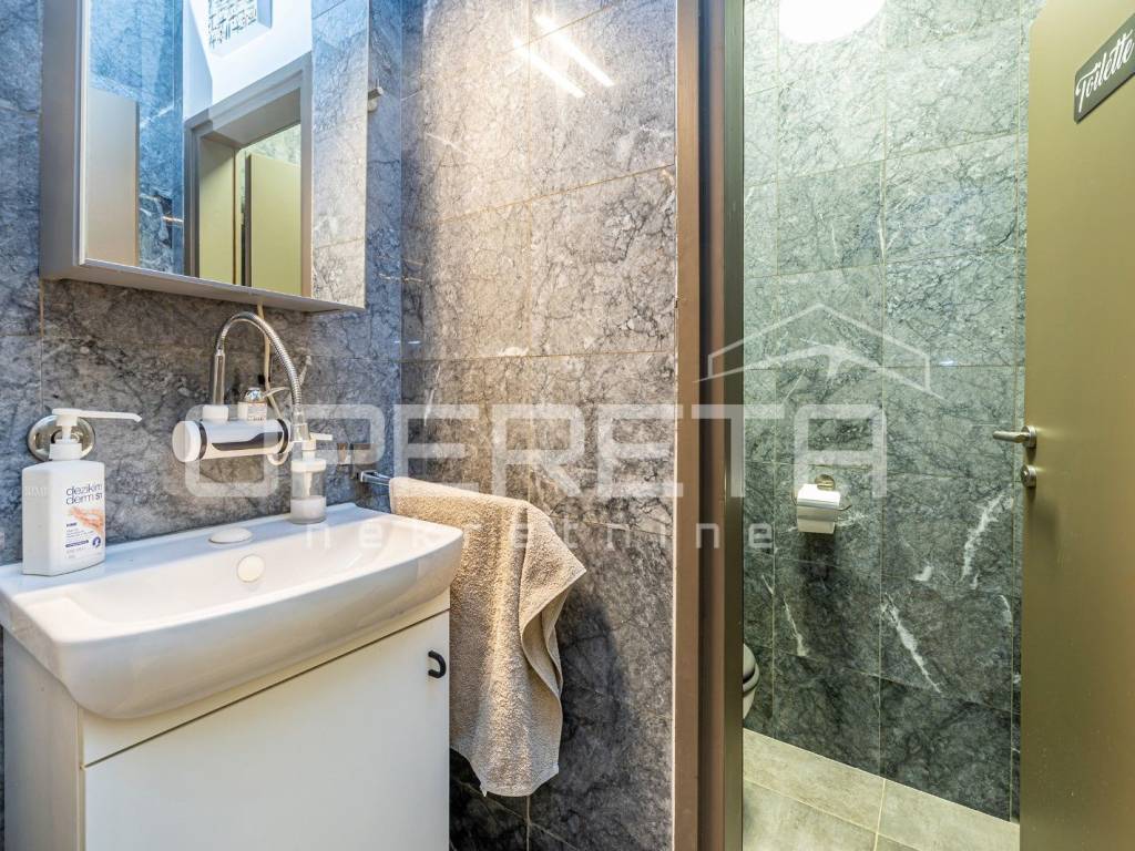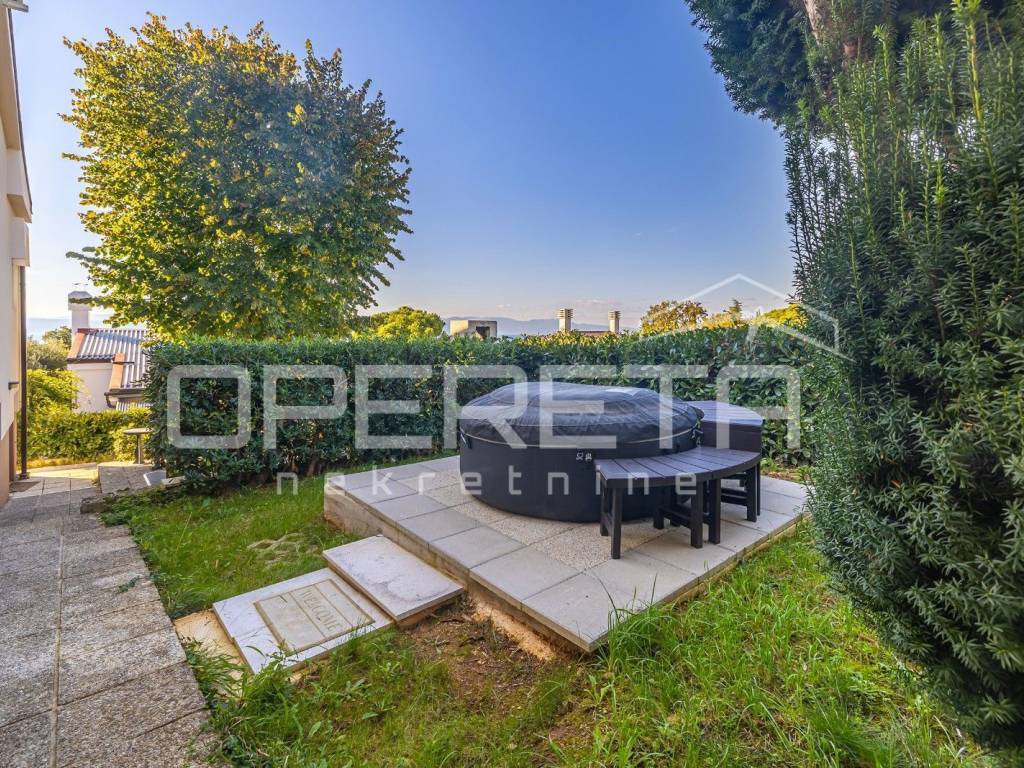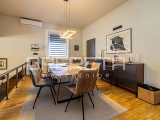 Das Haus wurde von einem renommierten Architekten entworfen und fügt sich harmonisch in die mediterrane Umgebung ein. Von nahezu allen Räumen eröffnet sich ein freier Blick auf die Kvarner-Bucht. Der funktionale Grundriss umfasst ein großzügiges Wohnzimmer mit Kamin und Essbereich, eine voll ausgestattete Küche, eine zusätzliche Hilfsküche, drei Schlafzimmer, zwei Badezimmer, ein separates WC, einen Abstellraum sowie eine große Garage.