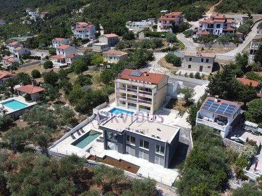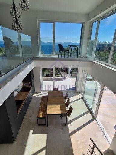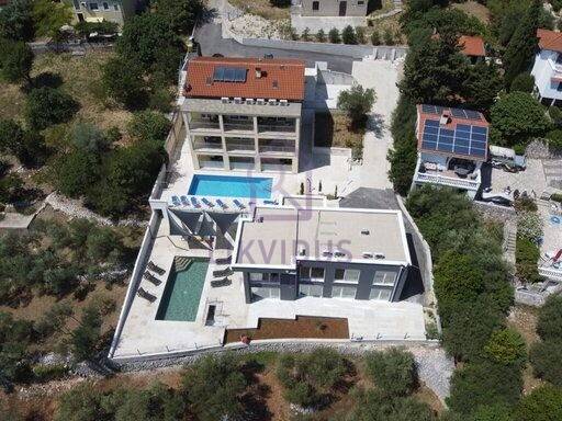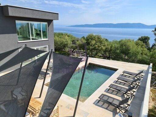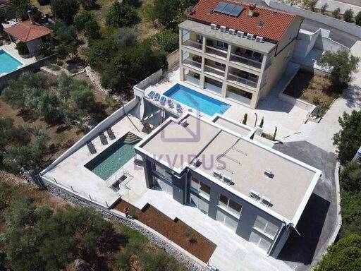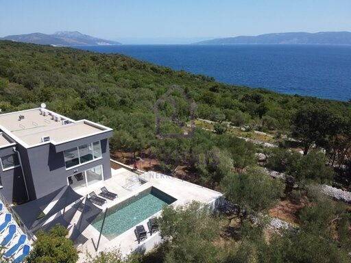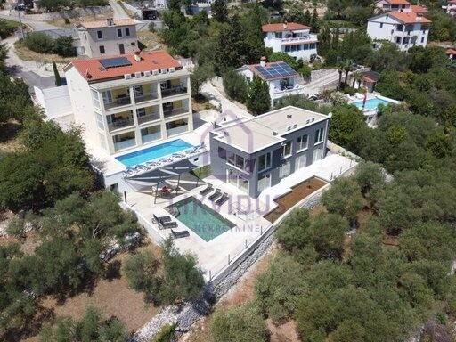 Na 1.100 m2 okućnice smještena je ova moderna vila sa grijanim bazenom u mjesu Ravni. Sastoji se od četiri spavaće sobe, četiri kupaonice, dva wc-a, kuhinje, blagovaonice i dnevnog boravka, te balkona s prekrasnim pogledom na bazen i more.