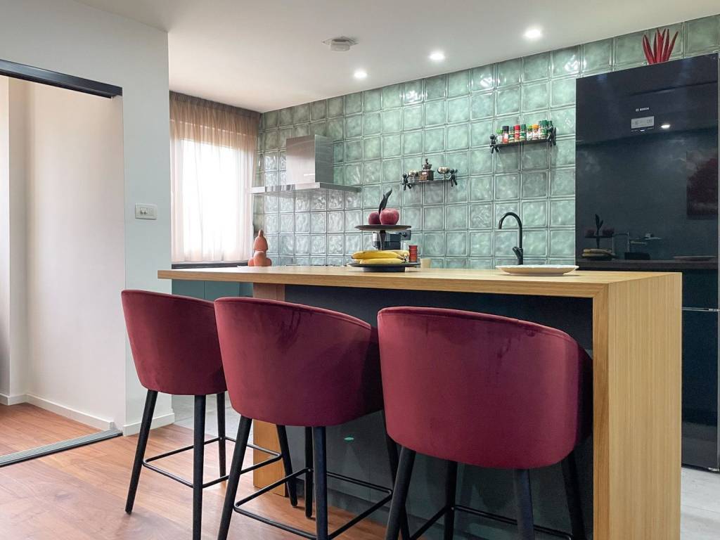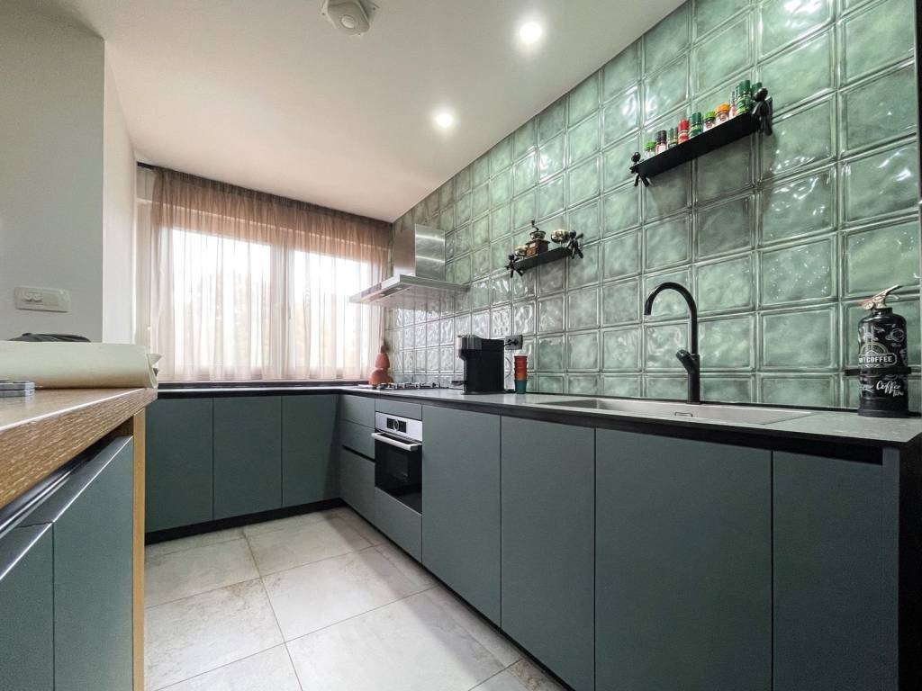 Kuhinja je izrađena od vrhunskog materijala s otpornom radnom pločom, i opremljena je Bosch aparatima (indukcija, selektivni plin, napa, parna pećnica, perilica suđa, hladnjak i aparat za kavu – svi pod garancijom). Nasuprot kuhinje nalazi se otok za blagovanje s poluvisokim stolicama i foteljama presvučenima u AquaClean tkaninu, jednako kao i BoxSpring kreveti u spavaćim sobama, što prostoru daje dojam profinjene harmonije i jednostavnog održavanja.