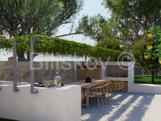 Der Außenbereich ist als repräsentativer und angenehmer Raum konzipiert und umfasst großzügige Terrassen, eine Außenküche mit Grill, Jacuzzi, Lounge-Bereich mit Kamin, Boccia-Bahn mit Sitzgelegenheit, Garten mit Gemüsebeeten und skulpturalen Elementen sowie Garage und Stellplätze.