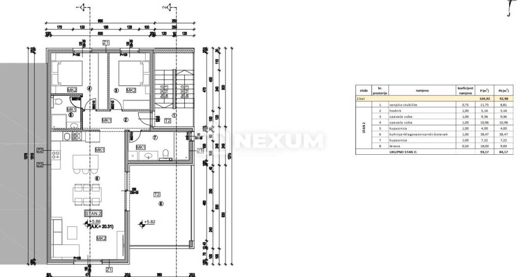 Die Wohnung S2 befindet sich im zweiten Stock des Gebäudes und hat eine gesamte Netto-Wohnfläche von 97 m², davon entfallen 75,17 m² auf die Innenfläche und 18 m² auf die Terrasse.
