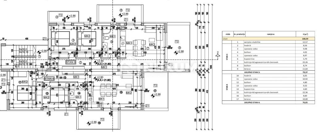 Zum Verkauf steht die Zweizimmerwohnung S4 im ersten Stock des Gebäudes mit einer Gesamtwohnfläche von 76,65 m², davon entfallen 53,25 m² auf den Innenbereich, 10 m² auf die Terrasse und 13,40 m² auf den Balkon.