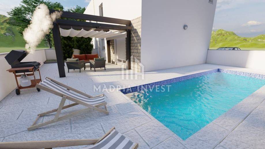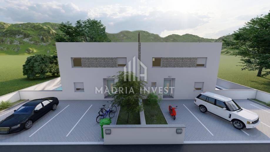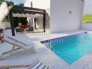 Modernes Neubauhaus, Fläche 143 m2 in Vir. Es besteht aus Erdgeschoss und Obergeschoss. Im Erdgeschoss gibt es eine Küche mit Esszimmer, ein Wohnzimmer, ein Badezimmer, einen Abstellraum und ein Schlafzimmer sowie einen internen Abstellraum, der zum ersten Stock der Villa führt. Im ersten Stock befinden sich zwei Schlafzimmer mit eigenem Bad und eine Waschküche von 8 m2. Heizung/Kühlung: Klimaanlagen, Fußbodenheizung und Kamin. Das Gebäude ist sehr gut gebaut: Wärmedämmung 10 cm. Die Fläche des Gartens beträgt 200 m2. Vor dem Gebäude befindet sich ein Parkplatz mit mehreren Parkplätzen und einem Schwimmbad. Die Villa ist 350 m vom Meer entfernt und verfügt über alle Einrichtungen des täglichen Lebens, geplanter Fertigstellungstermin ist Sommer 2022.