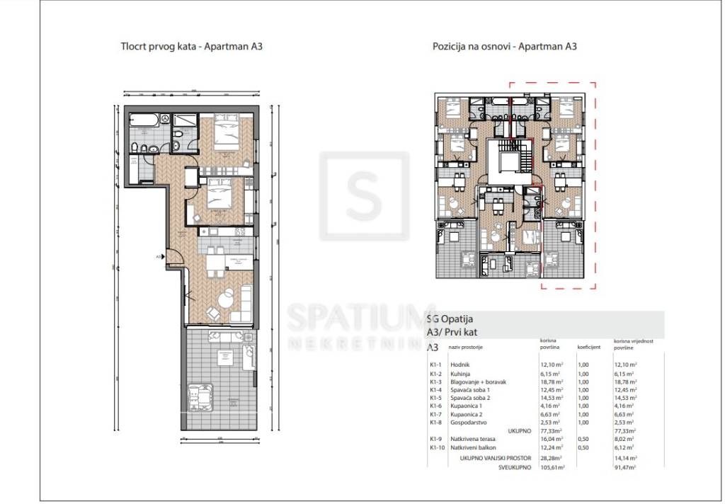 OPATIJA, wir bieten eine luxuriöse Wohnung in einem neuen Gebäude im ersten Stock in toller Lage an. Es besteht aus einem Flur, einem Wohnzimmer mit Küche und Esszimmer, zwei Schlafzimmern und zwei Badezimmern mit einer Gesamtfläche von 106,93 m2. Die Wohnung verfügt über eine überdachte Terrasse von 8,02 m2 und einen Balkon von 6,12 m2. Es wird mit erstklassigen Fußböden, Sanitärartikeln, Aluminiumschreinereien und Türen ausgestattet. Darüber hinaus wird das Gebäude über eine Tiefgarage und einen Aufzug verfügen. Einzugsfrist ist: 6/2025. Opatija, eine wunderschöne Küstenstadt an der Adria und berühmter Kurort aus dem 19. Jahrhundert, ist ein beliebtes Reiseziel für Touristen aus aller Welt. Die Stadt ist von einzigartigen Naturschönheiten umgeben. Es liegt unterhalb des Učka-Gebirges, das ein beliebtes Ziel für Bergsteiger und Wanderer ist. Es liegt am Übergang zwischen der grünen Region Istriens und der Küste und bildet ein perfektes Gleichgewicht der Landschaft. Die Stadt bietet einen wunderschönen Blick auf das Meer und die nahegelegenen Inseln Krk und Cres. Es ist umgeben von charmanten historischen Städten mit engen Gassen und einer reichen Geschichte. Opatija ist mit einer Vielzahl ungewöhnlicher Sehenswürdigkeiten, zahlreichen Stränden und klarem Meer geschmückt und die Straßen der Stadt sind übersät mit Häusern interessanter Architektur und Villen aus der Habsburgerzeit. Für alle weiteren Informationen können Sie uns gerne kontaktieren. Spatium nekretnine +385 51 272 903 +385 95/812-6476 info@spatium.hr