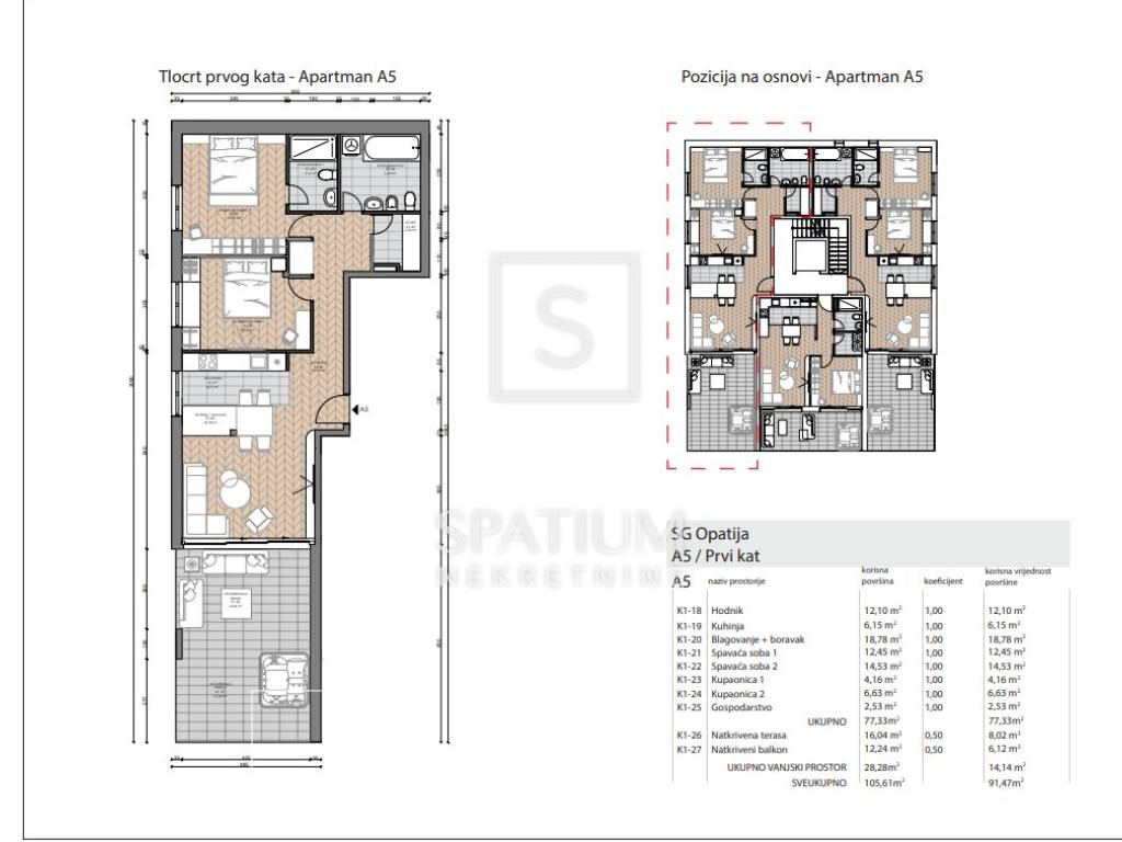 OPATIJA, wir bieten eine luxuriöse Wohnung in einem neuen Gebäude im ersten Stock in toller Lage an. Es besteht aus einem Flur, einem Wohnzimmer mit Küche und Esszimmer, zwei Schlafzimmern und zwei Badezimmern mit einer Gesamtfläche von 77,33 m2. Die Wohnung verfügt über eine überdachte Terrasse von 8,02 m2 und einen Balkon von 6,12 m2. Es wird mit erstklassigen Fußböden, Sanitärartikeln, Aluminiumschreinereien und Türen ausgestattet. Darüber hinaus wird das Gebäude über eine Tiefgarage und einen Aufzug verfügen. Einzugsfrist ist: 6/2025. Opatija, eine wunderschöne Küstenstadt an der Adria und berühmter Kurort aus dem 19. Jahrhundert, ist ein beliebtes Reiseziel für Touristen aus aller Welt. Die Stadt ist von einzigartigen Naturschönheiten umgeben. Es liegt unterhalb des Učka-Gebirges, das ein beliebtes Ziel für Bergsteiger und Wanderer ist. Es liegt am Übergang zwischen der grünen Region Istriens und der Küste und bildet eine perfekte Balance der Landschaft. Die Stadt bietet einen wunderschönen Blick auf das Meer und die nahegelegenen Inseln Krk und Cres. Es ist umgeben von charmanten historischen Städten mit engen Gassen und einer reichen Geschichte. Opatija ist mit einer Vielzahl ungewöhnlicher Sehenswürdigkeiten, zahlreichen Stränden und klarem Meer geschmückt und die Straßen der Stadt sind übersät mit Häusern interessanter Architektur und Villen aus der Habsburgerzeit. Für alle weiteren Informationen können Sie uns gerne kontaktieren. Spatium nekretnine +385 51 272 903 +385 95/812-6476 info@spatium.hr