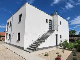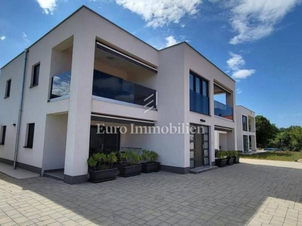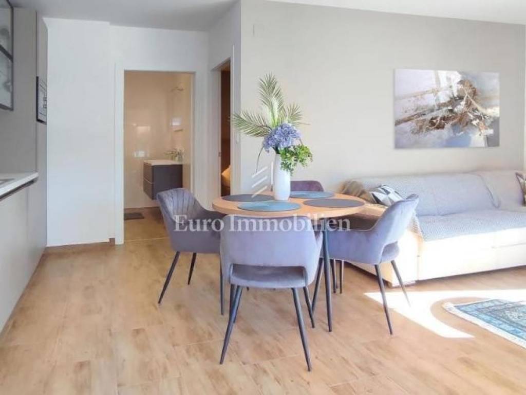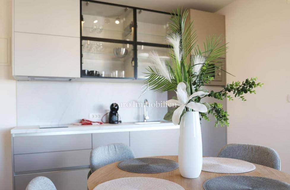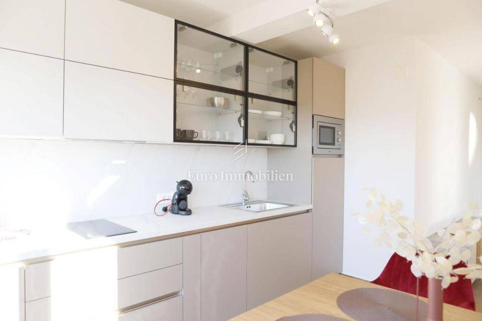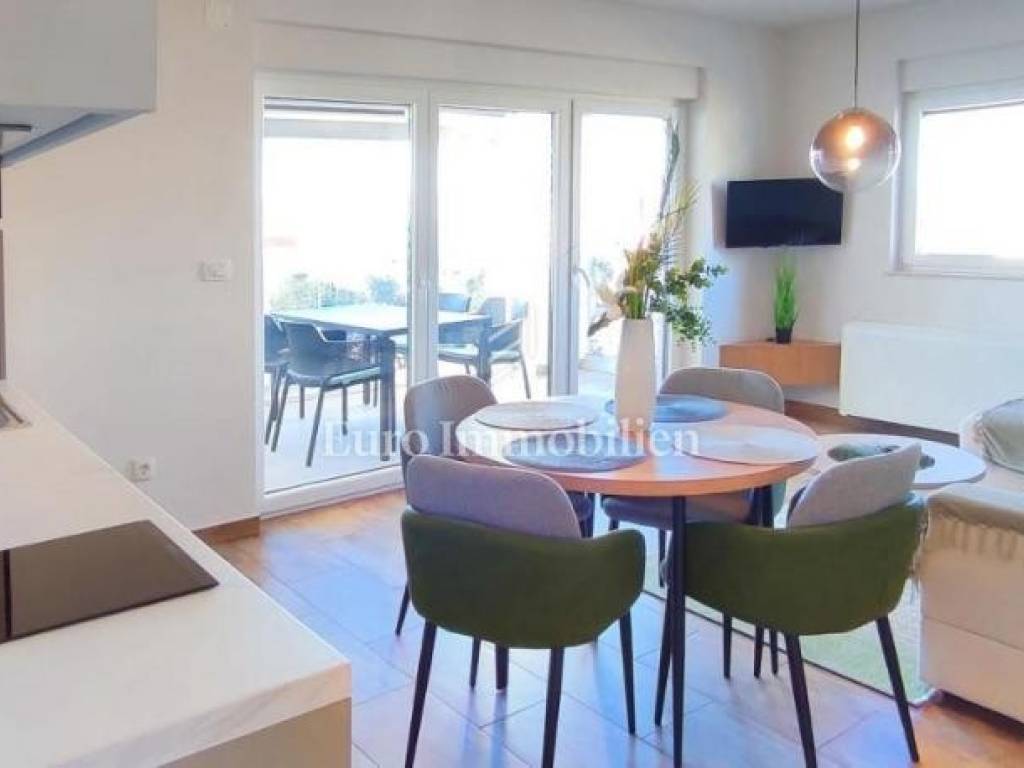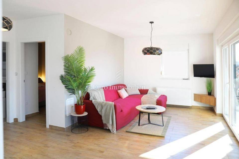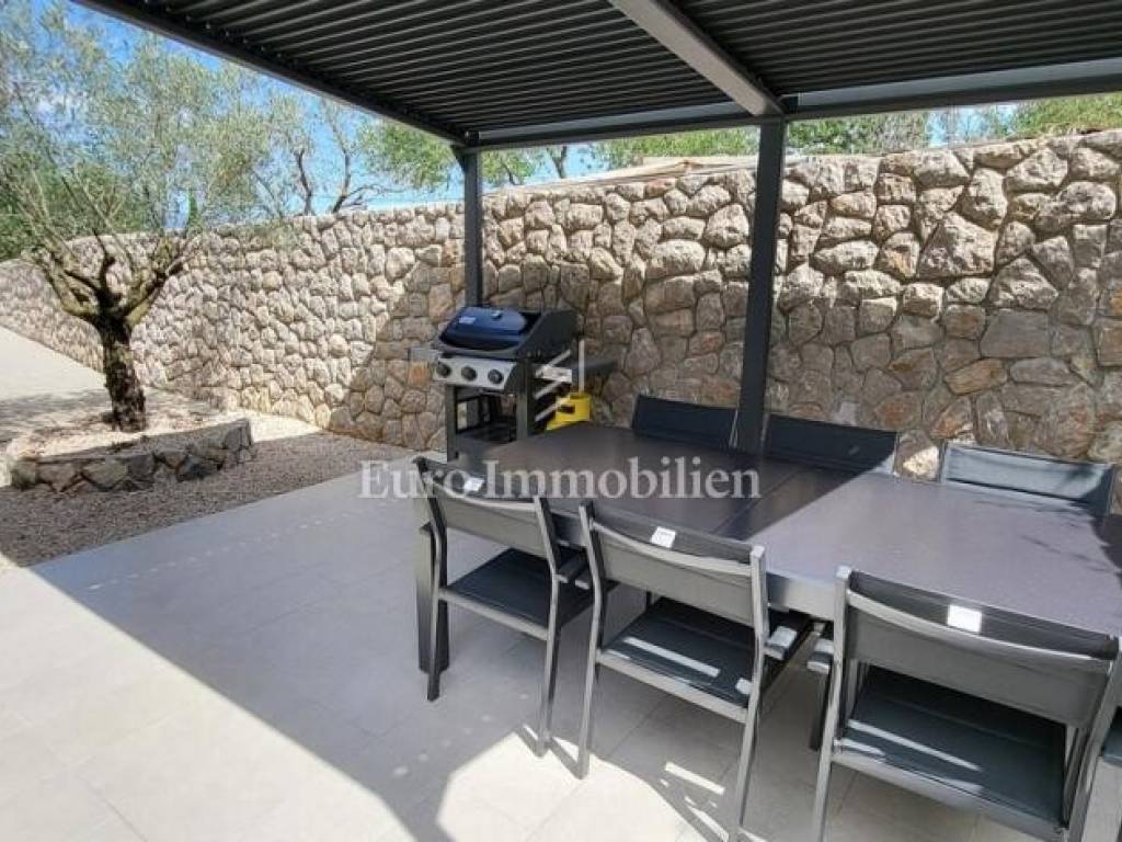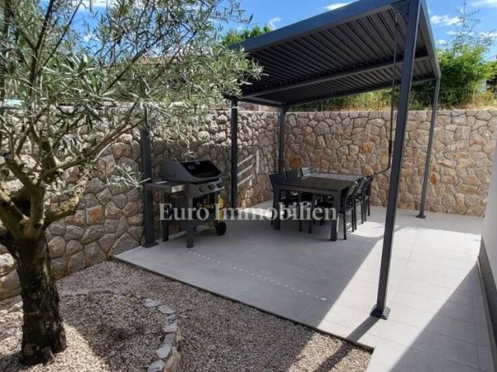 Insel Krk, Malinska, hochwertiges Einfamilienhaus mit 201,75 m² Wohnfläche, Baujahr 2021, auf einem 525 m² großen Grundstück. Das Haus besteht aus vier komfortablen und geschmackvoll eingerichteten Apartments. Jedes Apartment verfügt über ein Schlafzimmer, ein Wohnzimmer mit Küche und Essbereich, ein Badezimmer und eine Terrasse. Das Haus ist komplett möbliert und mit hochwertigen Möbeln und Geräten ausgestattet und verfügt über eine Wärmepumpe zum Heizen und Kühlen.