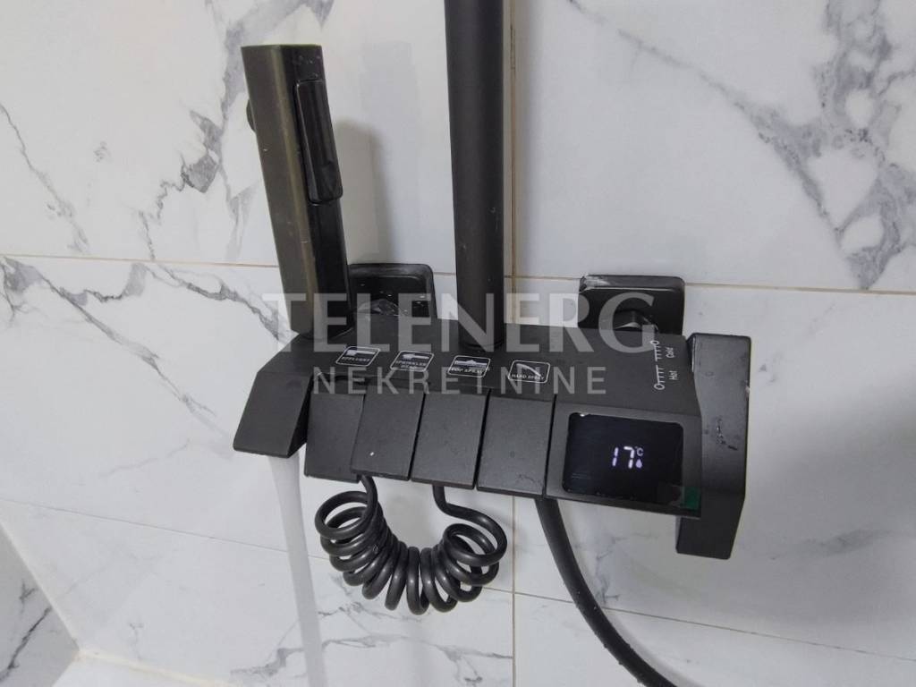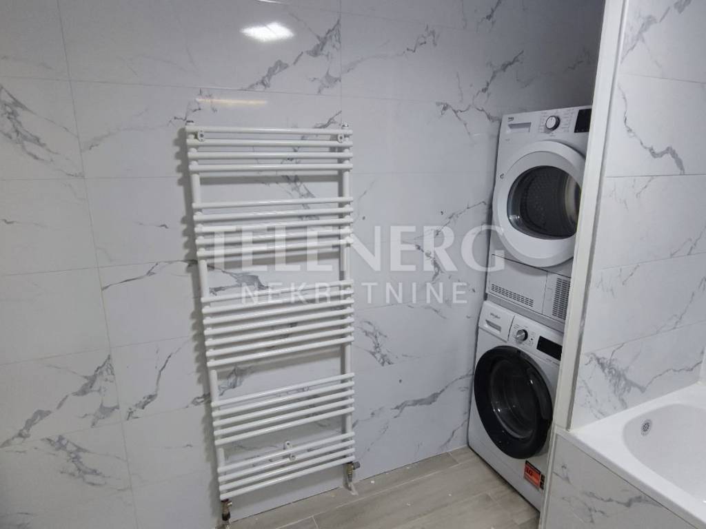 - bathroom approx. 8m2 with hanging rimless toilet bowl, double sink, bathtub 190x80 and thermostatic shower system, washing machine and dryer