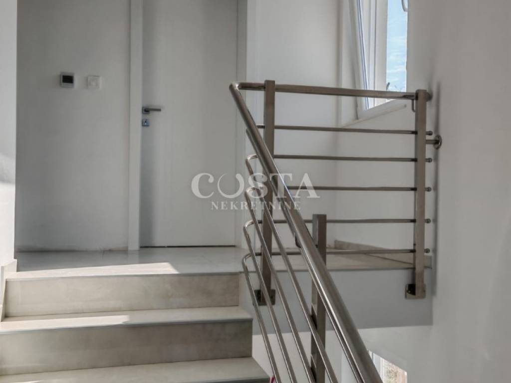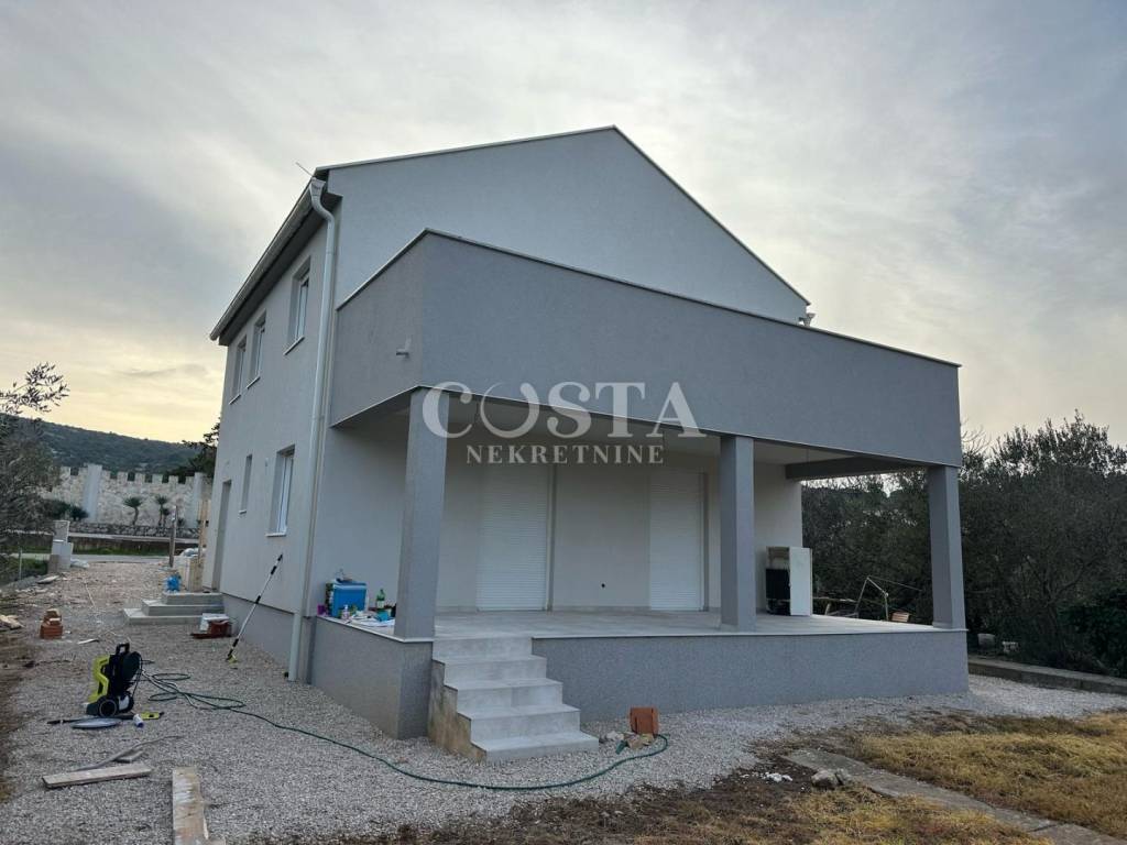 Neubauhaus in dritter Reihe zum Verkauf in Tkon auf der Insel Pašman. Das Haus mit einer Wohnfläche von 135 m² steht auf einem 450 m² großen Grundstück und erstreckt sich über ein Erdgeschoss und ein Obergeschoss. Im Erdgeschoss befinden sich Wohnzimmer, Küche, Essbereich, Badezimmer und Terrasse. Das Obergeschoss bietet drei Schlafzimmer, ein Badezimmer und eine Terrasse mit freiem Meerblick.
