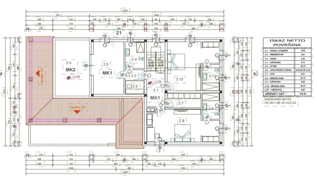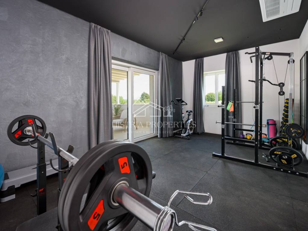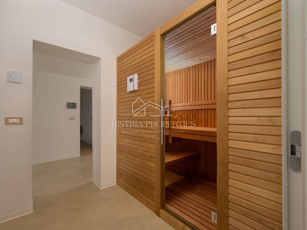 Eine Innentreppe führt in den ersten Stock, wo sich zwei weitere Schlafzimmer mit eigenem Bad, ein Ankleidezimmer und ein Wellnessbereich mit Sauna, Bad und Fitnessraum mit Zugang zu einer großzügigen, mit einer Pergola überdachten Terrasse befinden.