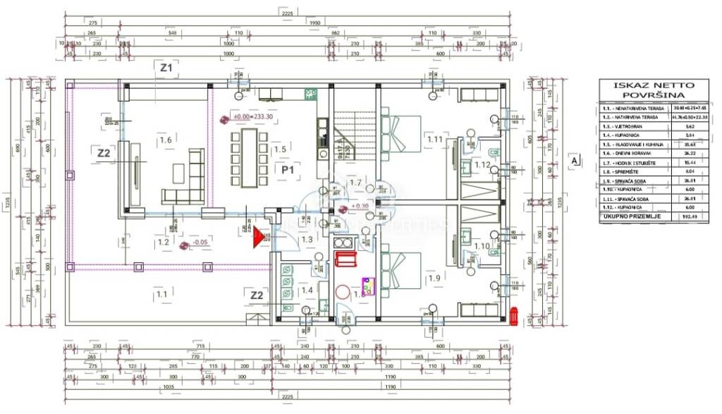Im Erdgeschoss befinden sich ein offener Wohnbereich mit Zugang zu einer großen, überdachten Terrasse mit Zugang zum beheizten Pool, zwei Schlafzimmer mit eigenem Bad, eine Waschküche mit Toilette und ein Technikraum/Abstellraum.