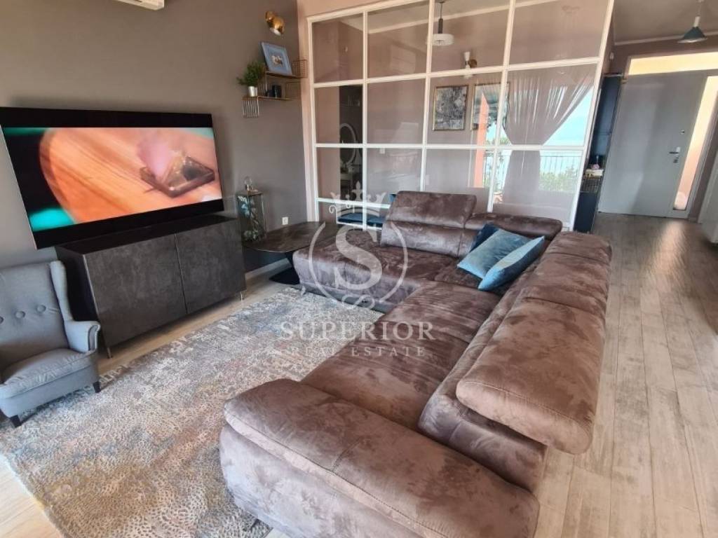 Vom Wohnzimmer aus gelangen Sie auf eine überdachte Loggia, einen sonnigen Balkon und eine großzügige Terrasse mit herrlichem Blick auf das Meer und Opatija. Der eigene Garten mit Grill lädt zum Entspannen ein. Separater Eingang für mehr Privatsphäre.