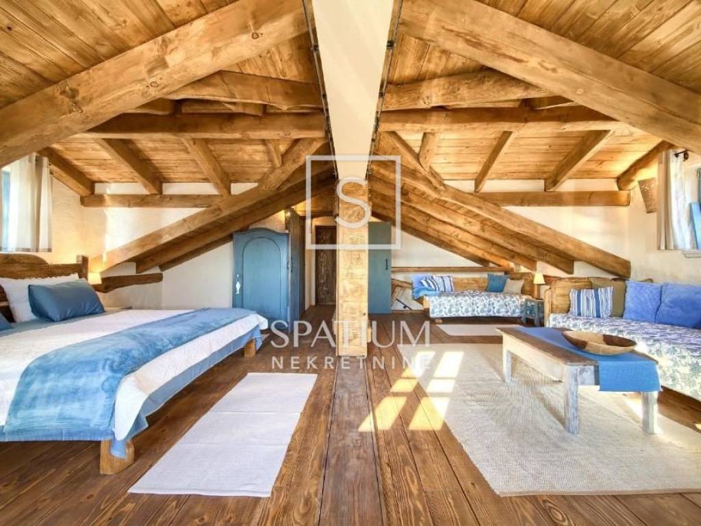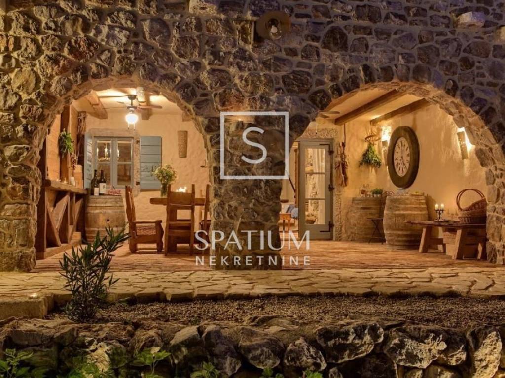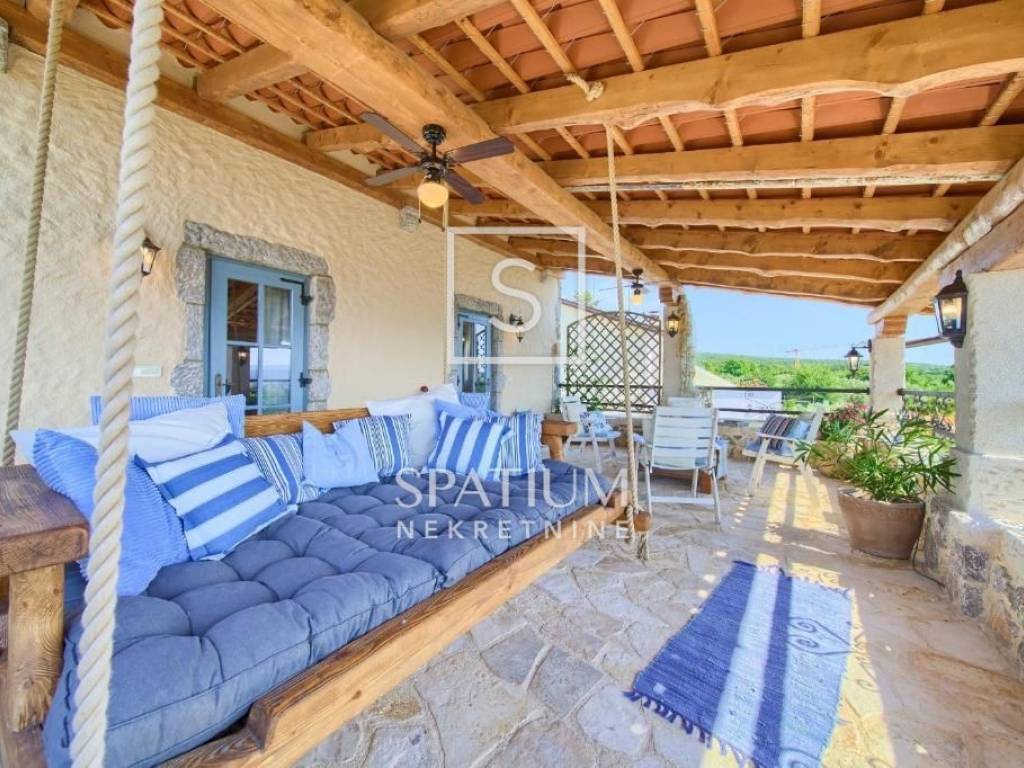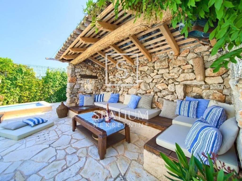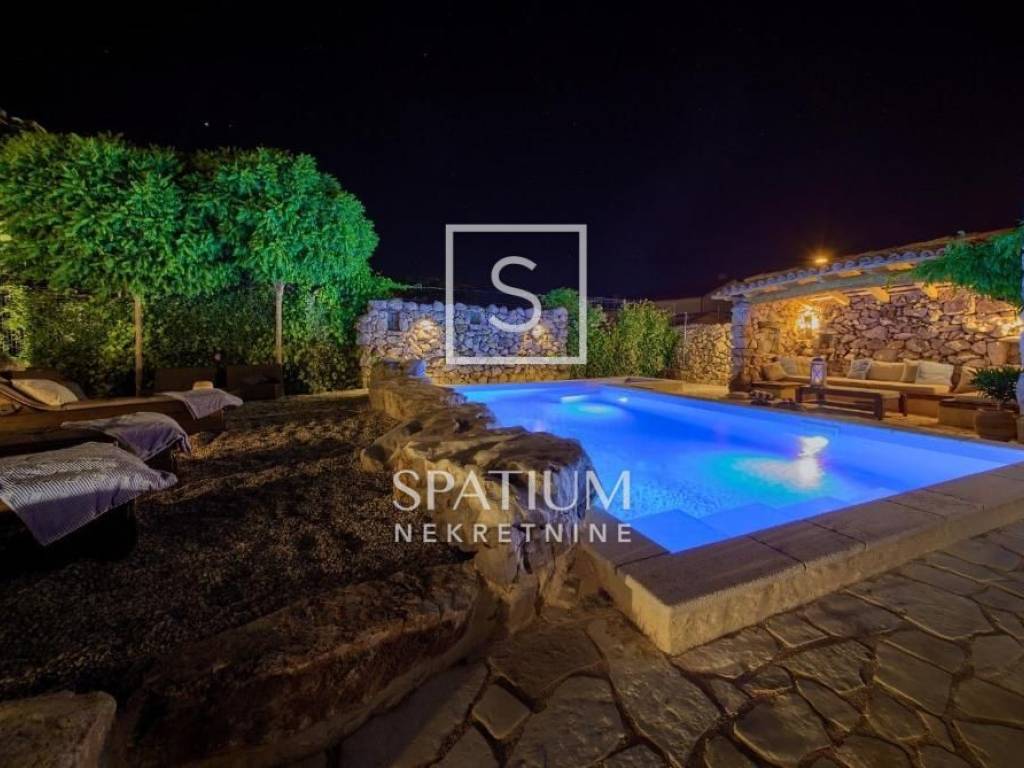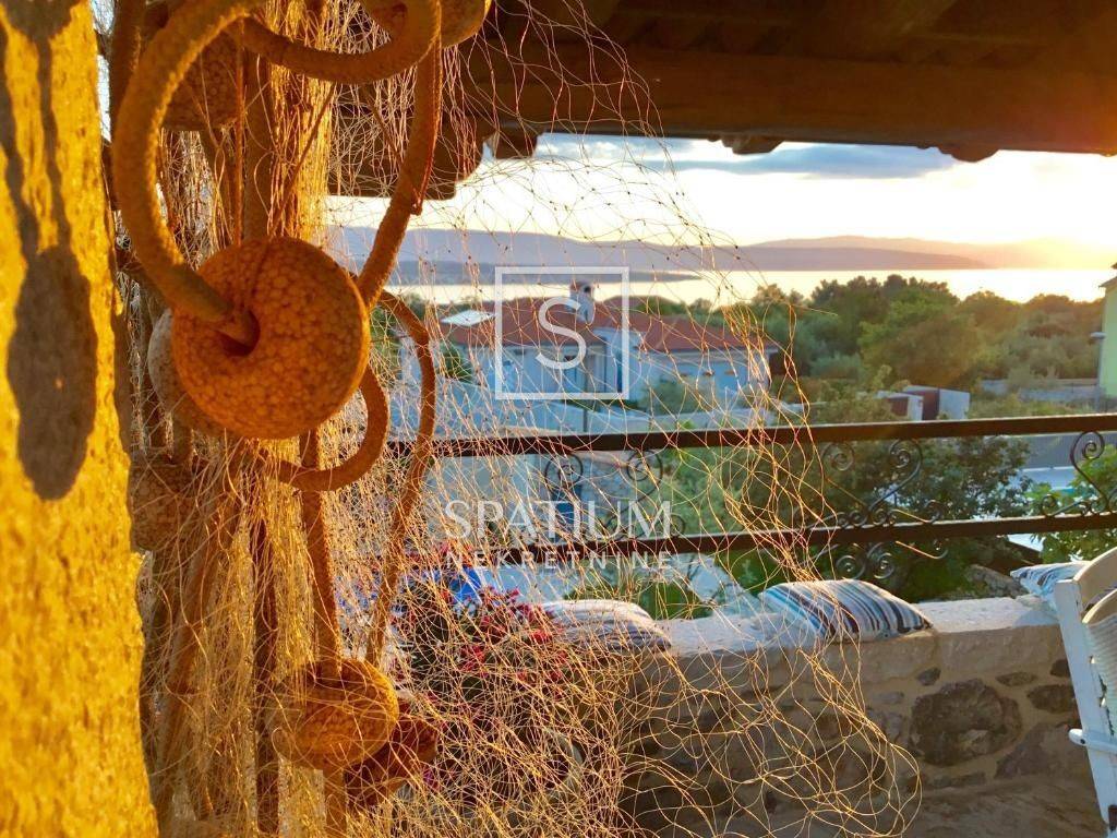 MALINSKA, Wir haben eine rustikale Steinvilla mit Swimmingpool und Meerblick in einem ruhigen Teil der Stadt angeboten. Das Erdgeschoss besteht aus einem Eingangsbereich, Küche und Esszimmer sowie einem geräumigen Wohnzimmer mit Kamin und Ausgang zur Loggia. Im ersten Stock befinden sich zwei Schlafzimmer und ein Badezimmer. Jedes Zimmer hat einen eigenen Ausgang zur überdachten Terrasse, die einen schönen Blick auf das Meer bietet. Im Dachgeschoss befinden sich zwei weitere Schlafzimmer und ein Badezimmer. Im weitläufigen Garten gibt es ein Nebengebäude – einen Weinkeller, einen Swimmingpool und zwei Parkplätze, einen Steintisch mit Steinbänken für zehn Personen und einen Grill. Die Immobilie ist eine ideale Investitionsmöglichkeit, kategorisiert für touristische Vermietung, sowie die Möglichkeit für ein langfristiges Familienleben.