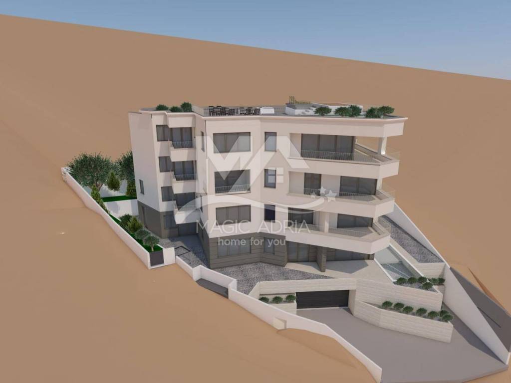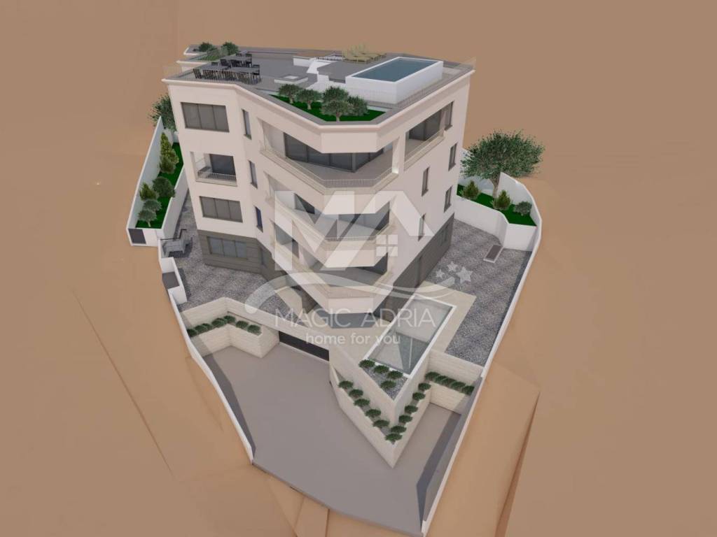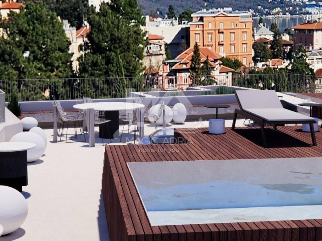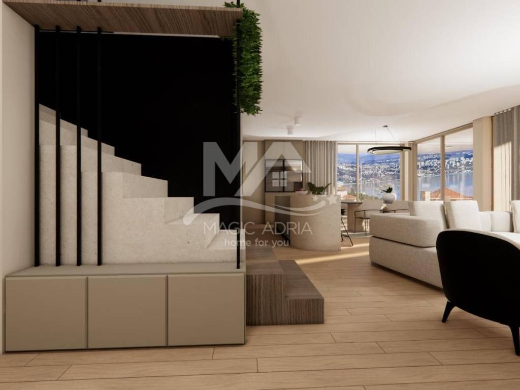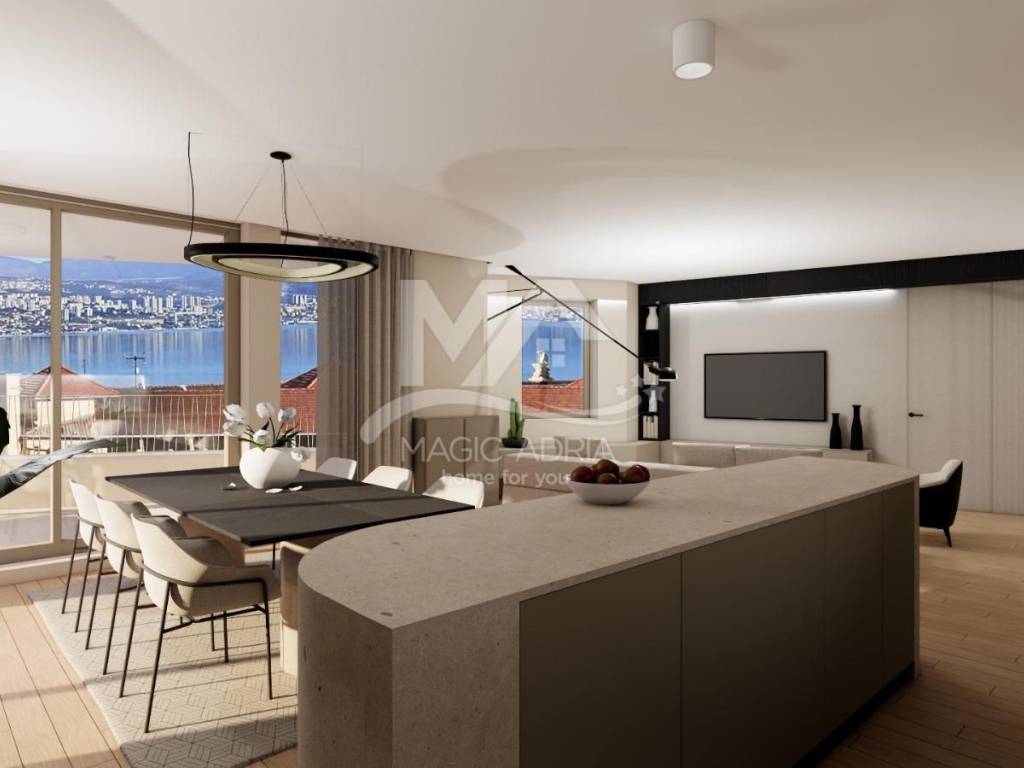 Ein luxuriöses Penthouse zum Verkauf im Zentrum von Opatija, mit einem beeindruckenden Blick auf ganz Opatija und die Kvarner-Bucht. Dieses geräumige Apartment befindet sich in einem neuen Gebäude und erstreckt sich über die dritte Etage und die Dachterrasse. Es bietet eine hervorragende Kombination aus modernem Design, hochwertigen Materialien und einer unglaublichen Lage.