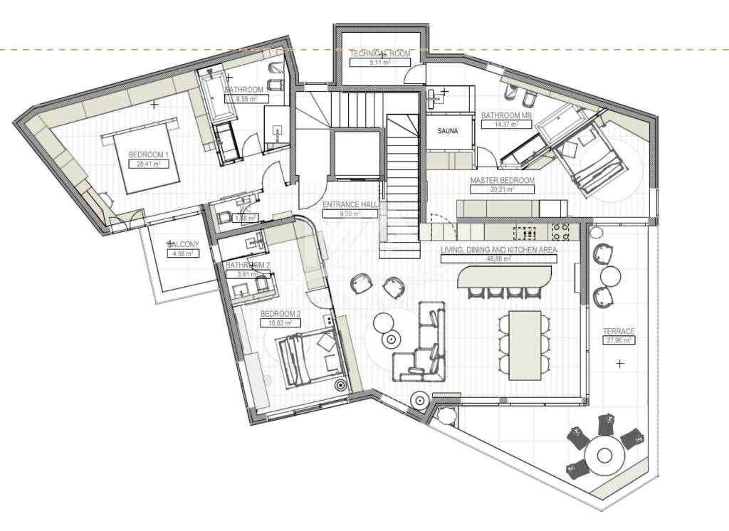 Zimmer 1: Fläche 39,25 m² - Schlafbereich (12,34 m²), Garderobe (7,38 m²), Badezimmer (12,40 m²), Sauna (2,2 m²) und Abstellraum (5,11 m²).